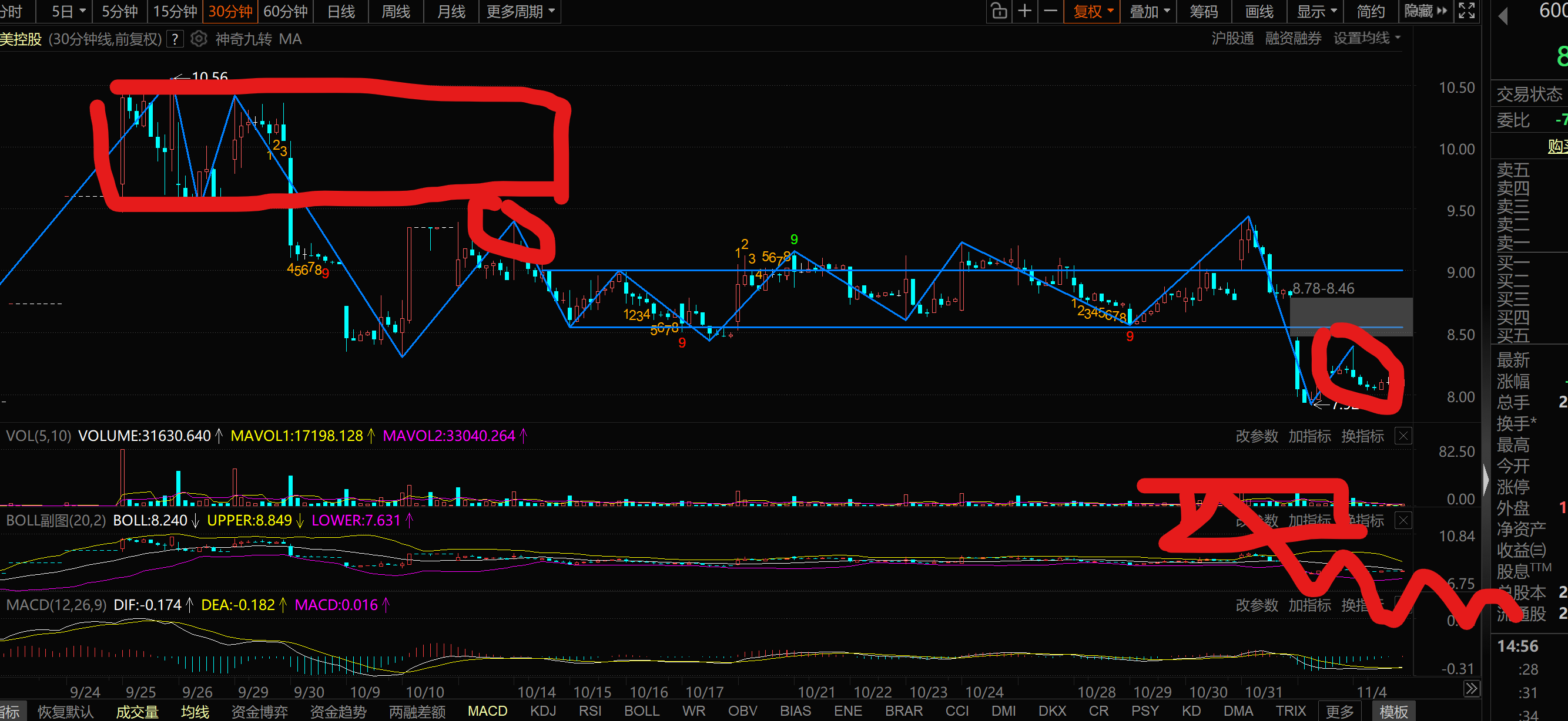 那只有 再度 打破 7.9的底分型 才能 出现 下一个走势中枢震荡 后 不知会不会 转好向上了