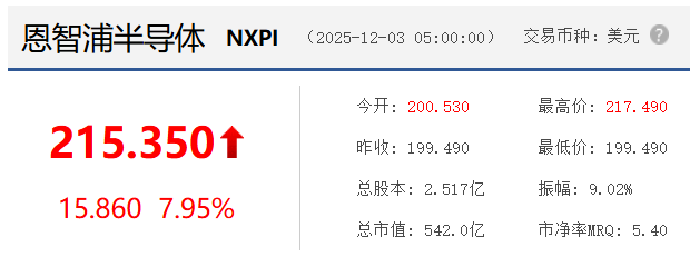 CPU巨头英特尔股价暴涨,恩智浦半导体大幅上涨8%