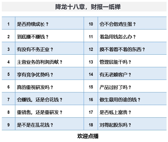 【前言】财报分析,就是公司业绩的“质检表”。质量好的产品,使用的安全性更高;质地好的公司,投资的安全性更高。我们的财务图表,精选18套22个指标和比率,以一页纸的篇幅,从业务、管理、财务、回报四个维度对公司进行透视,帮助投资者对目标公司进行快速研判,对同行公司进行快速比较,从而让投资决策变得更简单、更安全。