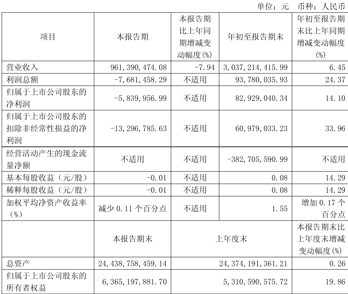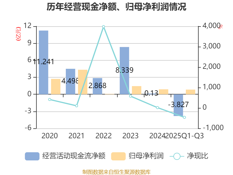 2025年前三季度,公司经营活动现金流净额为-3.83亿元,同比减少9397.07万元;筹资活动现金流净额-1.04亿元,同比减少11.17亿元;投资活动现金流净额-2.67亿元,上年同期为-9.36亿元。