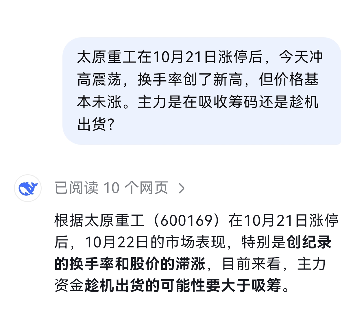 问了deepseek,太原重工放量滞涨,出货的可能性极大,加上尾盘拉升,明天局势