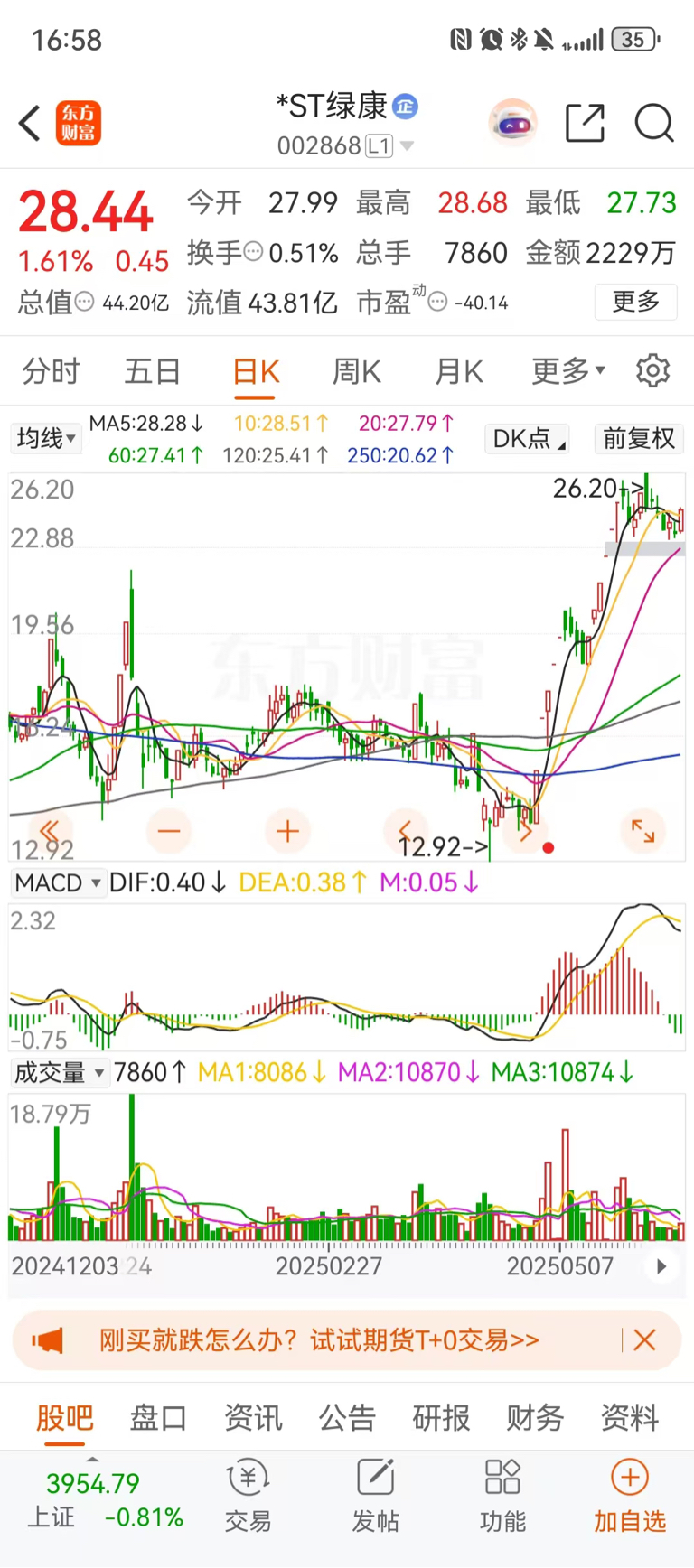我觉得,周二不要恐慌,没有退市风险,业绩在好转也不亏损,看看这个ST票,当天跌停