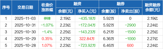 融资方面,当日融资买入0元,融资偿还435.18万元,融资净偿还435.18万元,连续3日净偿还累计750.44万元。融券方面,融券卖出0股,融券偿还0股,融券余量5.92万股,融券余额16.46万元。融资融券余额合计2.19亿元。