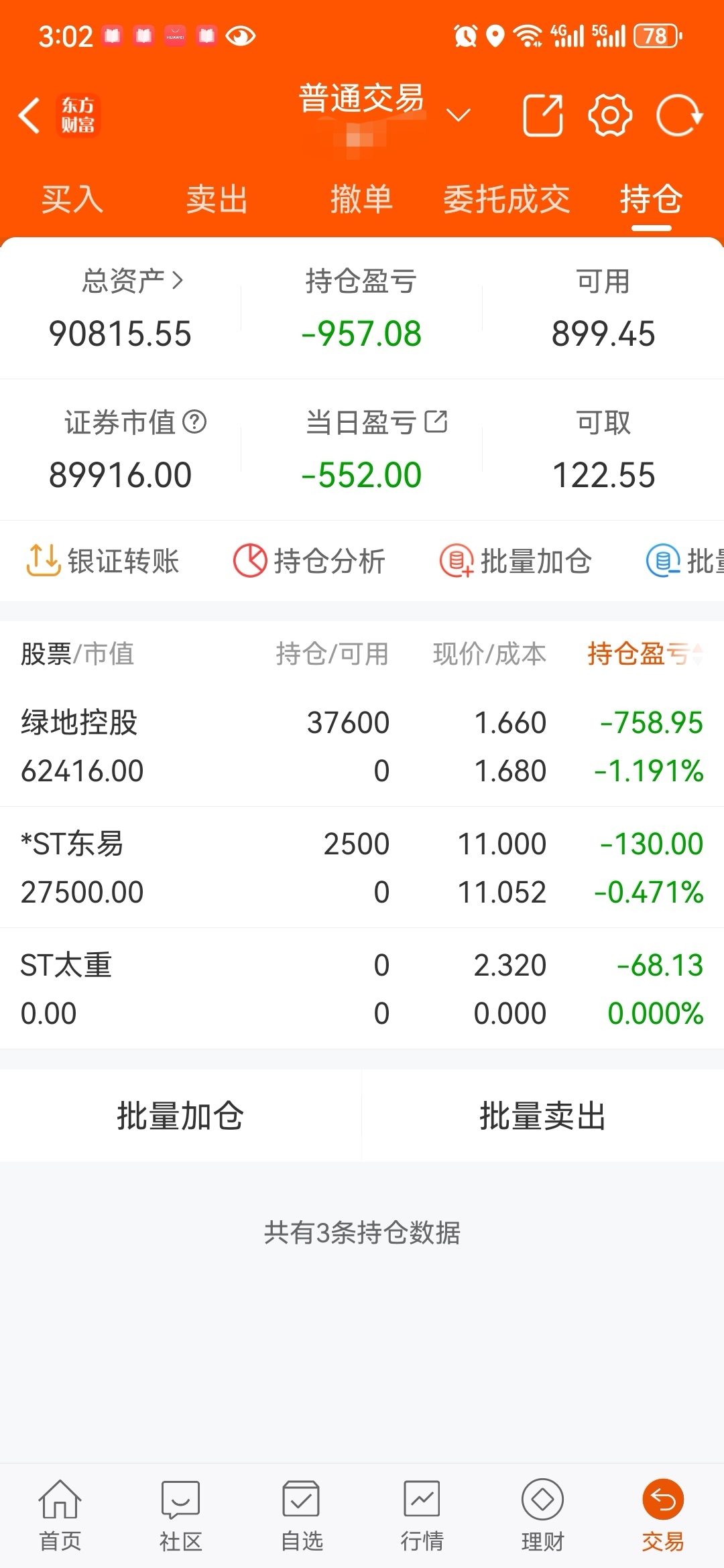 $*ST东易(SZ002713)$ $绿地控股(SH600606)$ $*ST万方(SZ000638)$ 今日亏损552,割了太重,买进东易和绿地,绿地下周一又要割掉,东易看看有没有填权行情,没有的话又要割掉。节奏必须快,讨厌持股,持股就是风险,都是来卖公司的,必须比它们卖得快。已把前天充进的1万提现,保持9万基数不变。每天发帖激励自己,9万起步,向第一目标50万进发