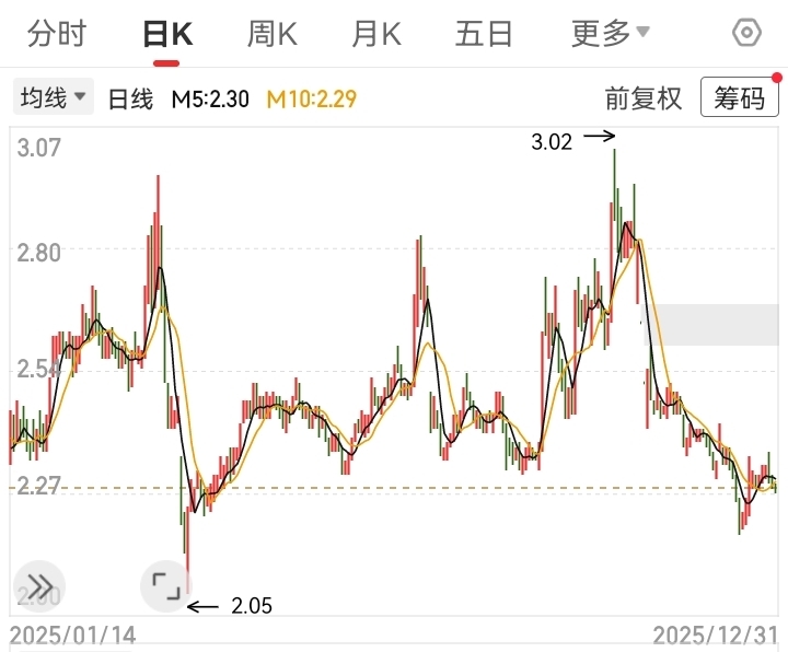 日线级别:短期均线系统(5日、10日、20日均线)呈现多头排列,5日均线在2.29元附近形成支撑。12月19日收出一根小阳线,收盘价2.30元,涨幅2.68%,显示短期有企稳迹象。