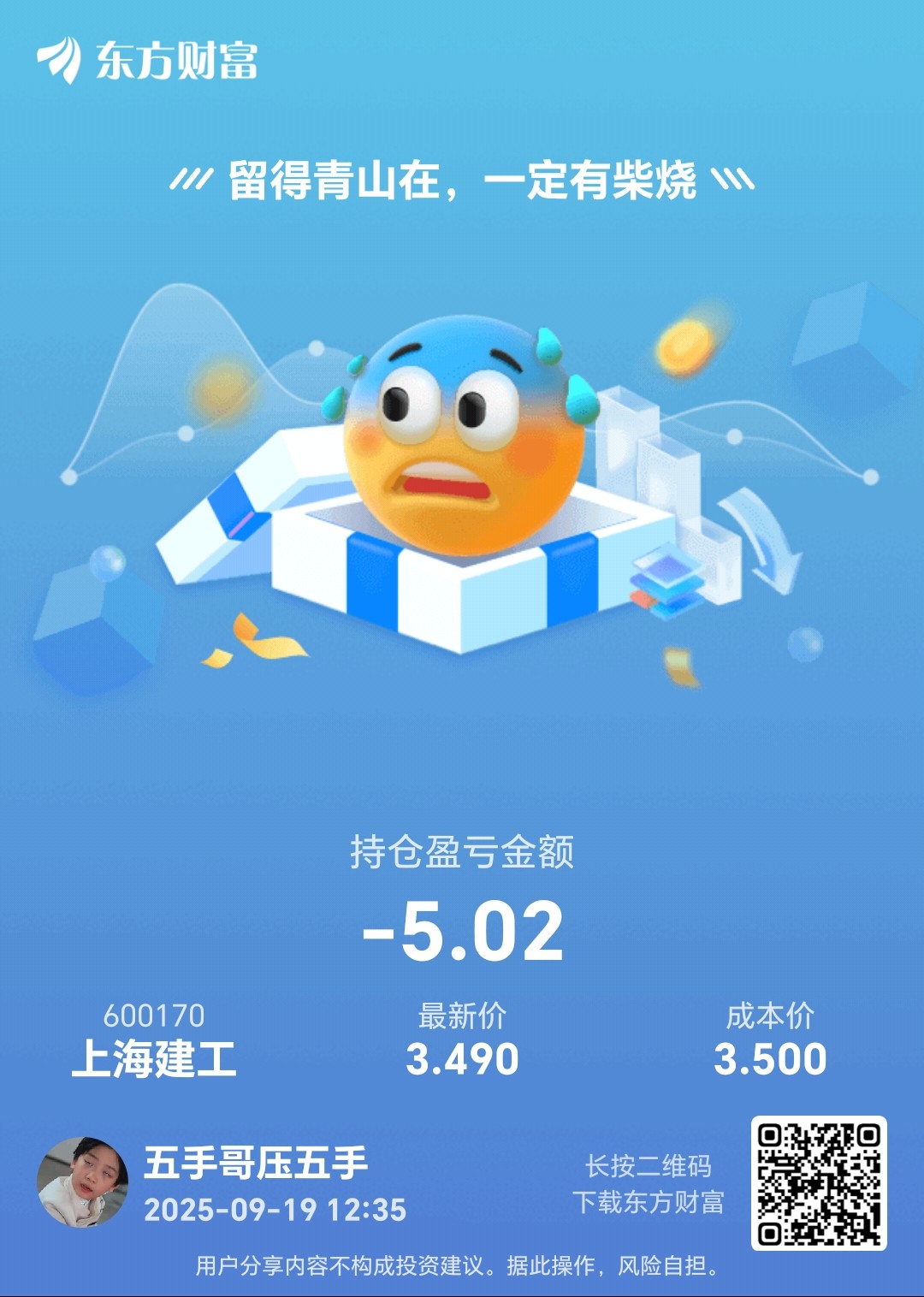 竟然还有人质疑五手哥是模拟盘,五手哥年纪比爷叔轻,仓位比爷叔少,成本比爷叔低。怎么样五手哥都是可以跑赢爷叔的存在,上海建工每一年都在分红,五手哥变成五叔,五爷的过程就是人生的过程。现在价位我的赢面概率太高了。敢跌回2元吗?到时候五手哥再买五手,怎么样五手哥都是赢,赢定了。
