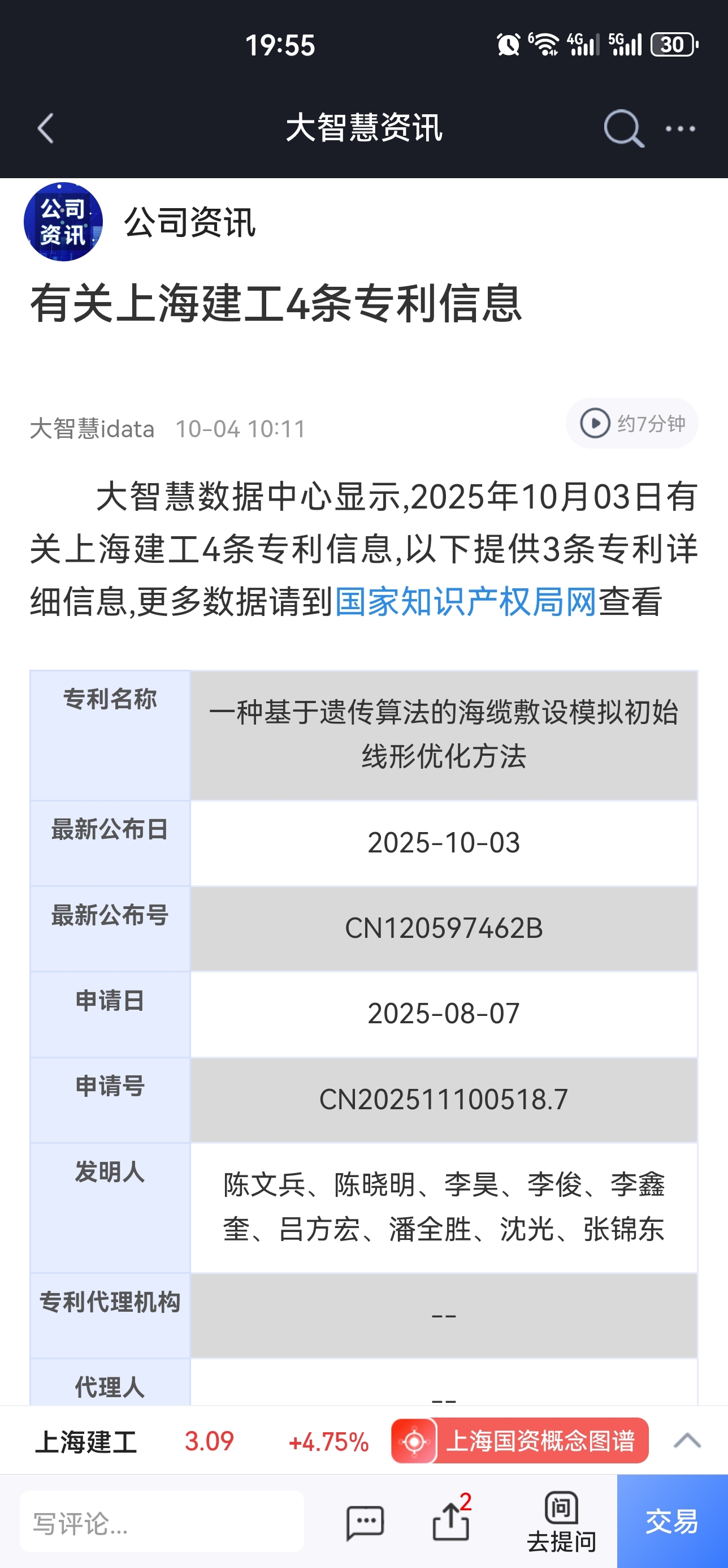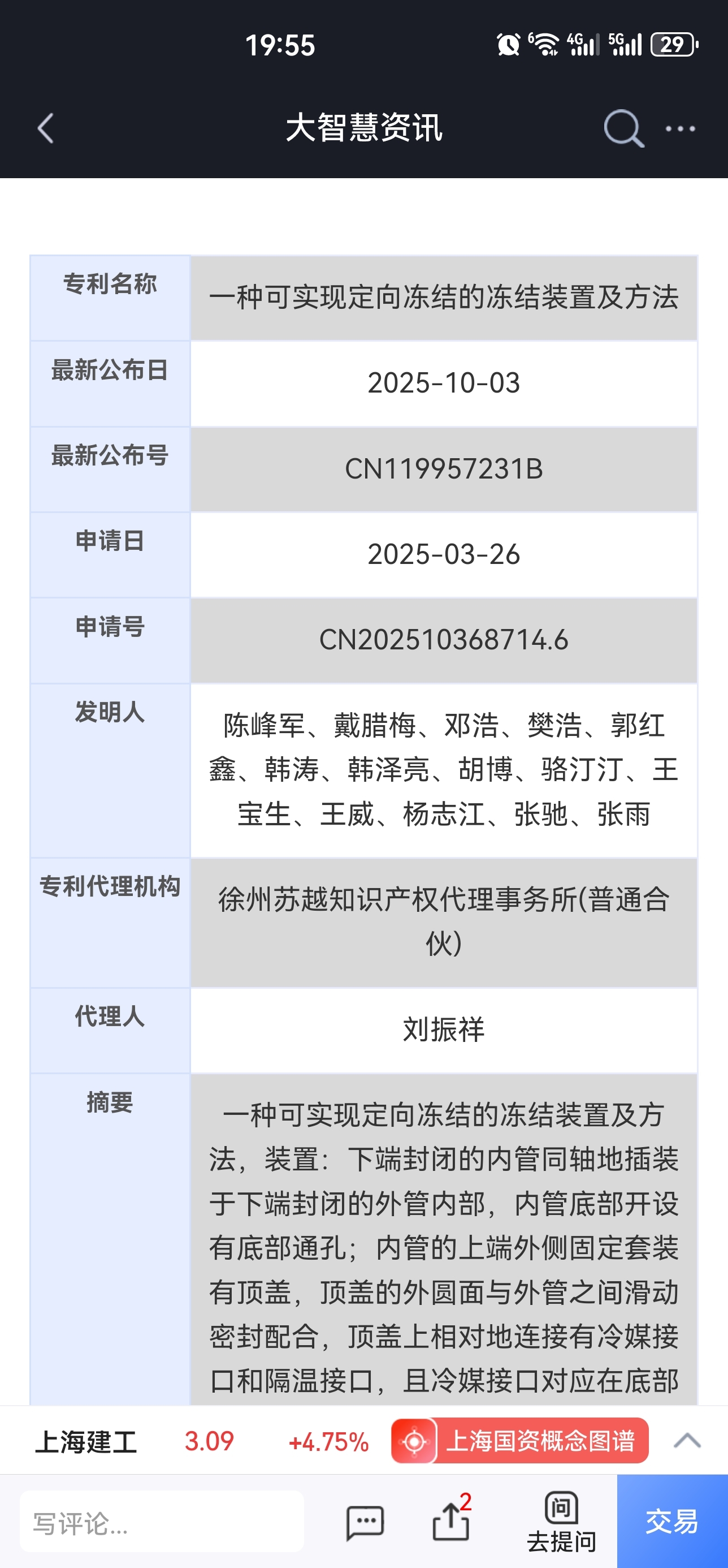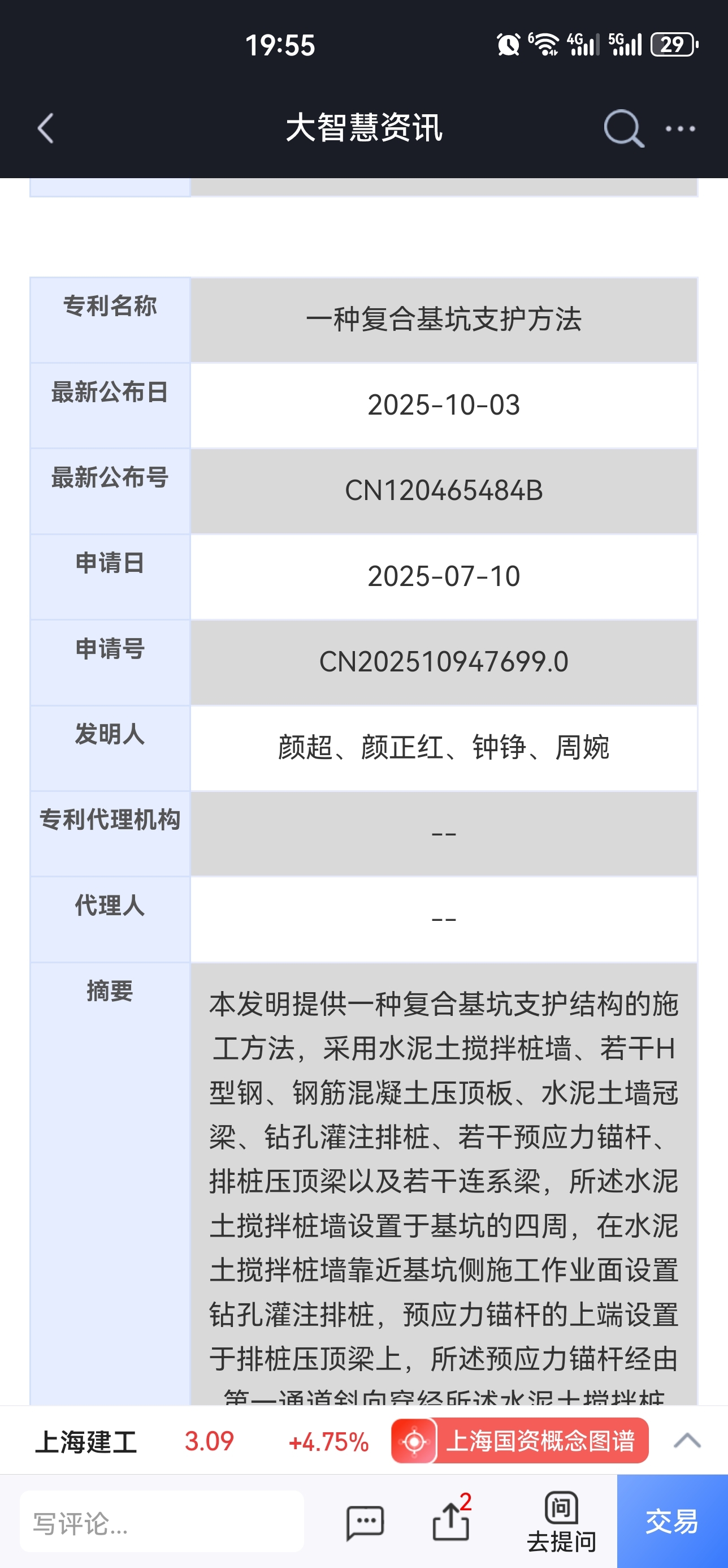 有关上海建工4条专利信息大智慧数据中心显示,2025年10月03日有关上海建工4