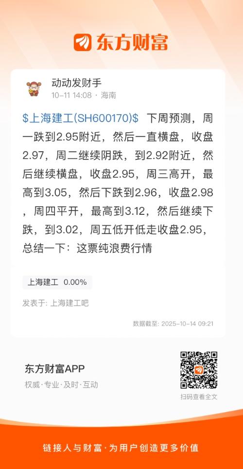 $上海建工(SH600170)$ 下周预测,周一跌到2.95附近,然后一直横盘,收盘2.97,周二继续阴跌,到2.92附近,然后继续横盘,收盘2.95,周三高开,最高到3.05,然后下跌到2.96,收盘2.98,周四平开,最高到3.12,然后继续下跌,到3.02,周五低开低走收盘2.95,总结一下:这票纯浪费行情