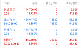 利和兴:专用设备概念,今天竞价直接出现大低开,接近-10的低开,但是在接近开磐的阶段,出现了两个超千万的大单,直接把谷价从-10拉到了-6的位置,在老财看来,-10开和-6开,老财还是喜欢-10,因为它越靠近五日线支撑,所以,我也是分批次西干了,中间波动也比较平和,老财总体把诚本控制住了,现在几乎跟主梨紫金的成本一致,现在去看,今天尾盘虽然修复的不多,但是K线刚好踩在五日线上,形态不错,主梨控盘非常漂亮。