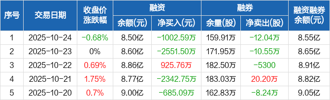 融资方面,当日融资买入7786.64万元,融资偿还8789.23万元,融资净偿还1002.59万元。融券方面,融券卖出17.66万股,融券偿还29.7万股,融券余量159.91万股,融券余额465.34万元。融资融券余额合计8.55亿元。
