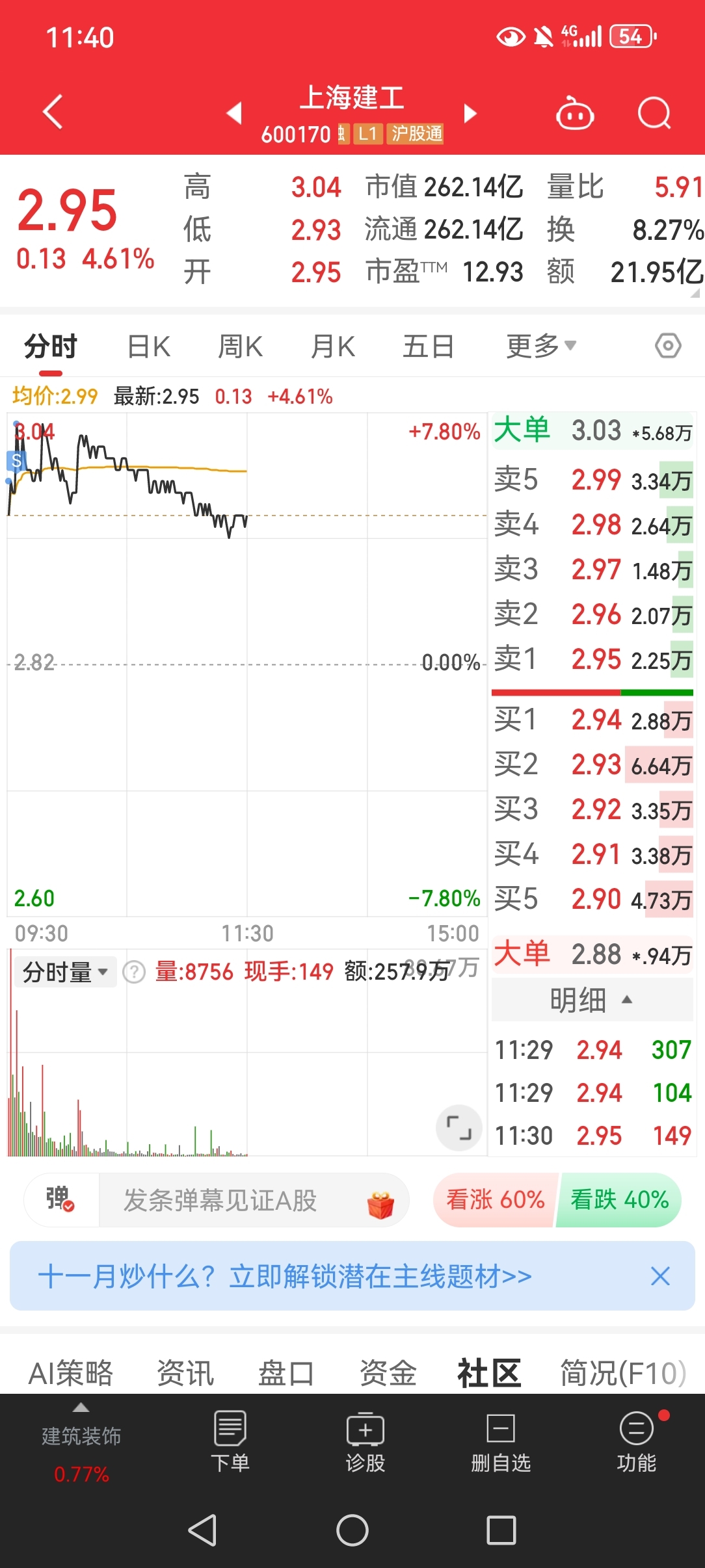 $上海建工(SH600170)$ 2.98,3.03已出,你可以涨停了