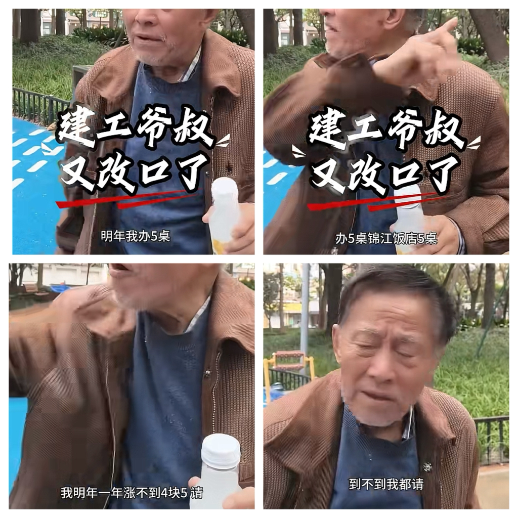 建工爷叔昨天又改口了,明年不管到不到4.5元都请客,锦江饭店5桌高级奶糖和中华烟