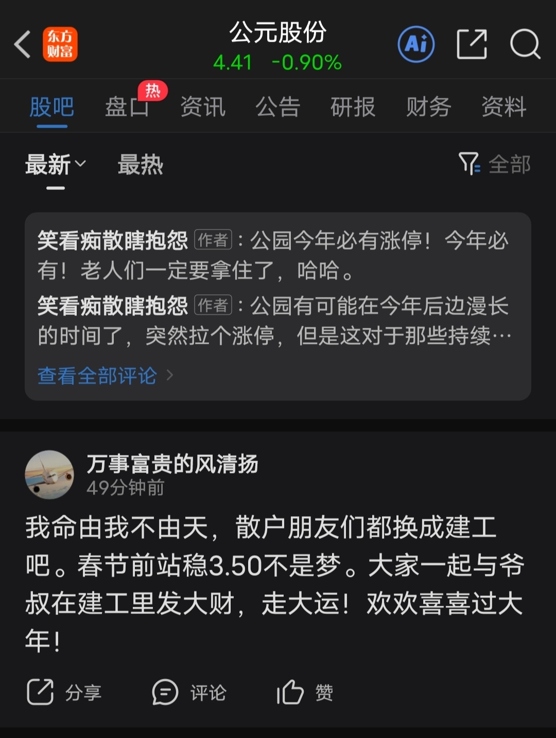 我已经在公元群里为建工喊人了。建工,你就争点气先站稳三元,再上攻3.50,把人气