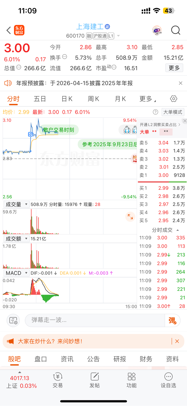 $上海建工(SH600170)$ 我做短线。这个走势反弹性非常大,但昨天就是要深跌,心态炸了,昨天尾盘硬头皮又加了仓博超跌指标了。已变成重仓了。今天大盘的走势,结合节假日到来,这么多年过来,就没多少次节前涨的。而今早的走势很失望,我知道今天大概率不会跌很多,就怕它收盘给我涨个0.3-0.5的就很尴尬了,唉