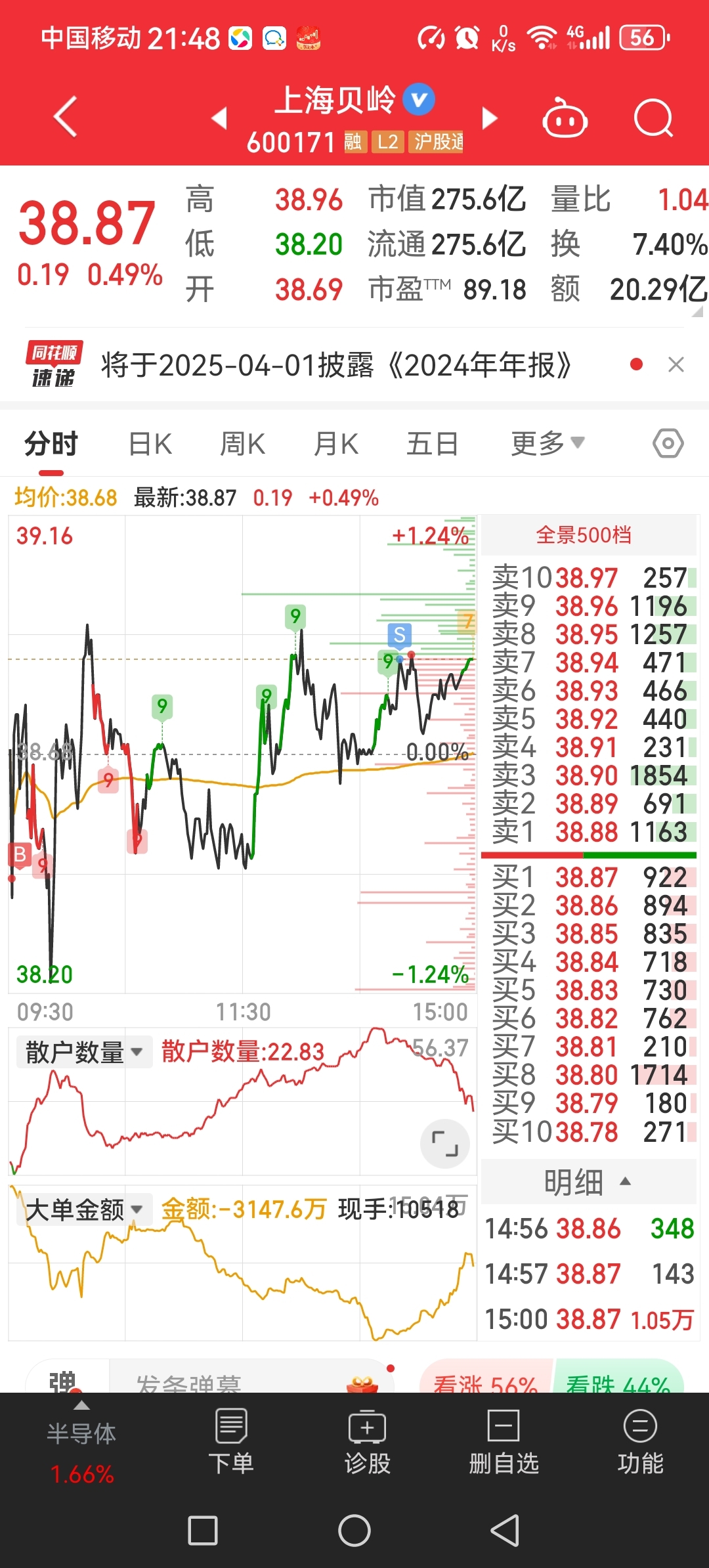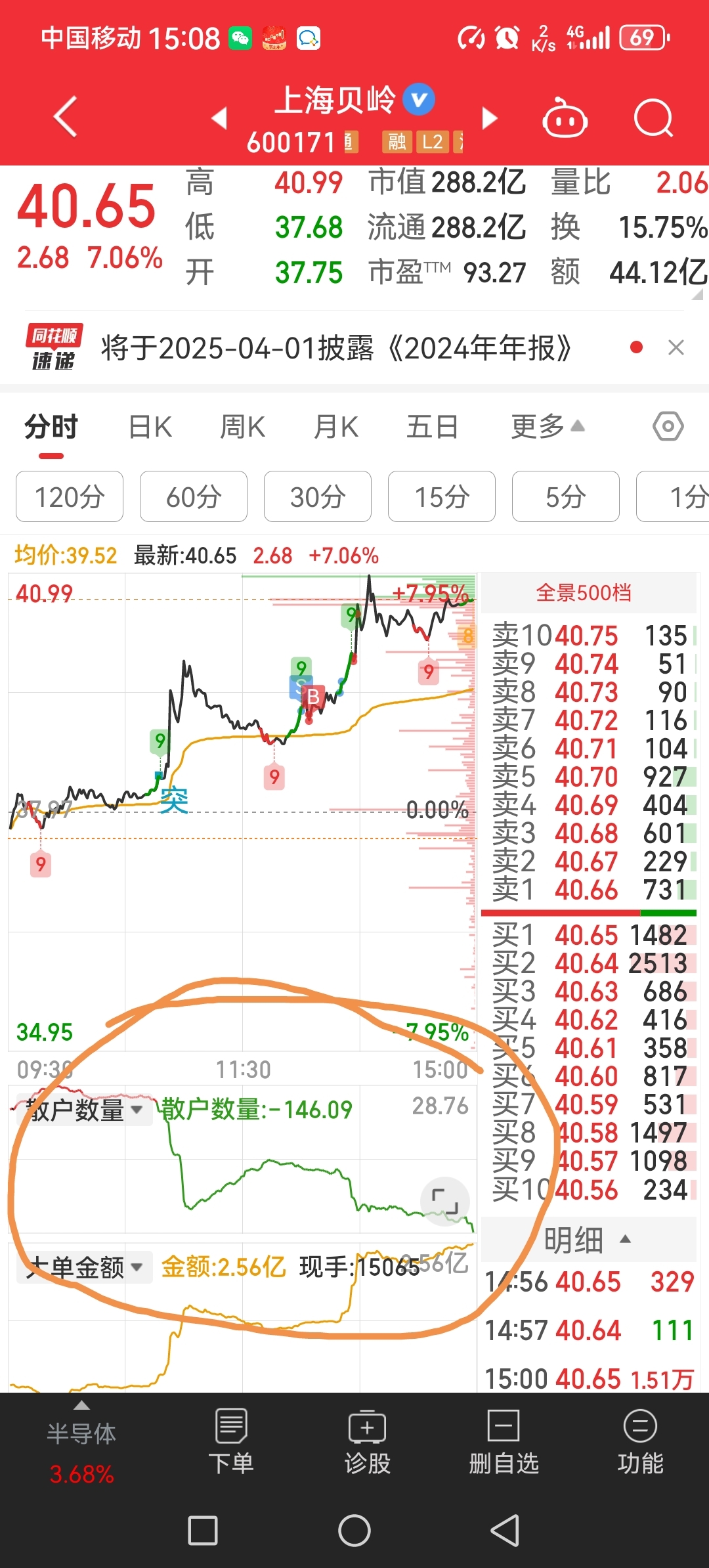 $上海贝岭(SH600171)$ 周一出,昨天打满,今天差点T飞(图2),明天拟涨停,理由:从图2黄圈中散户和大单数量变化看,今天走了不少散户。从周、日、60、120分线看,均为多头趋势排列且刚开始双金叉。量能和换手率同步放大,且进入极少量筹码套牢区)。