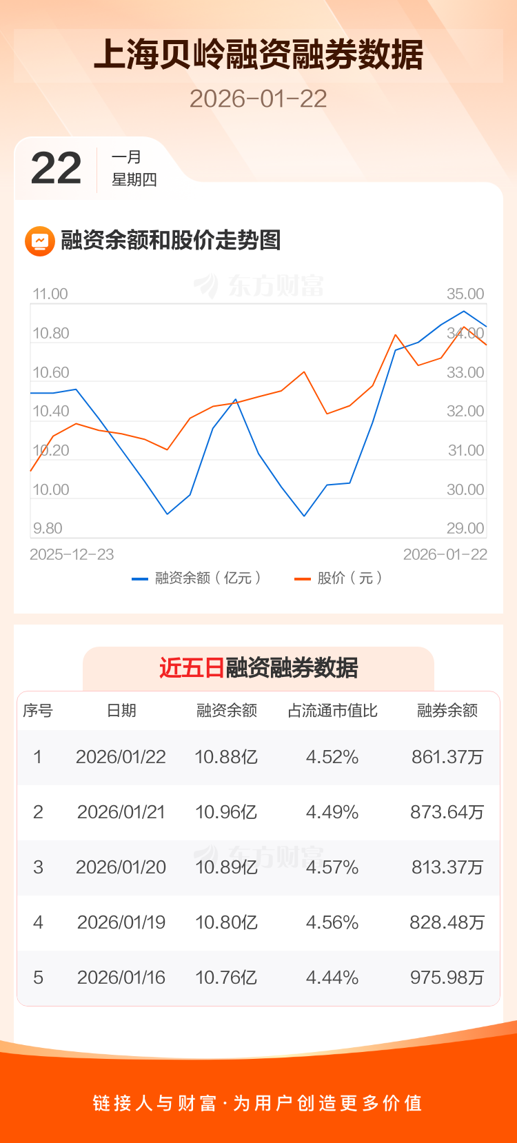 交易所最新数据显示,上海贝岭于2026年1月22日获融资买入8977.41万元,融资偿还9712.16万元,当日融资净偿还734.75万元。目前,该股融资余额10.88亿,占流通市值比例为4.52%。
