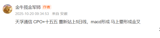 $天孚通信(SZ300394)$天孚通信:今日可能会呈现震荡调整态势。10月20日天孚通信报收于157.97元,上涨7.76%,换手率5.76%,成交额71.39忆元,注力姿金净流入7.24忆元。技术面来看,该股近期平均成本为159.81元,筹码平均交易成本为166.93元,目前股价靠近压力位164.50元,存在一定回调压力。且游姿姿金净流出3.82亿元,散户姿金净流出3.42亿元,市场存在一定分歧。