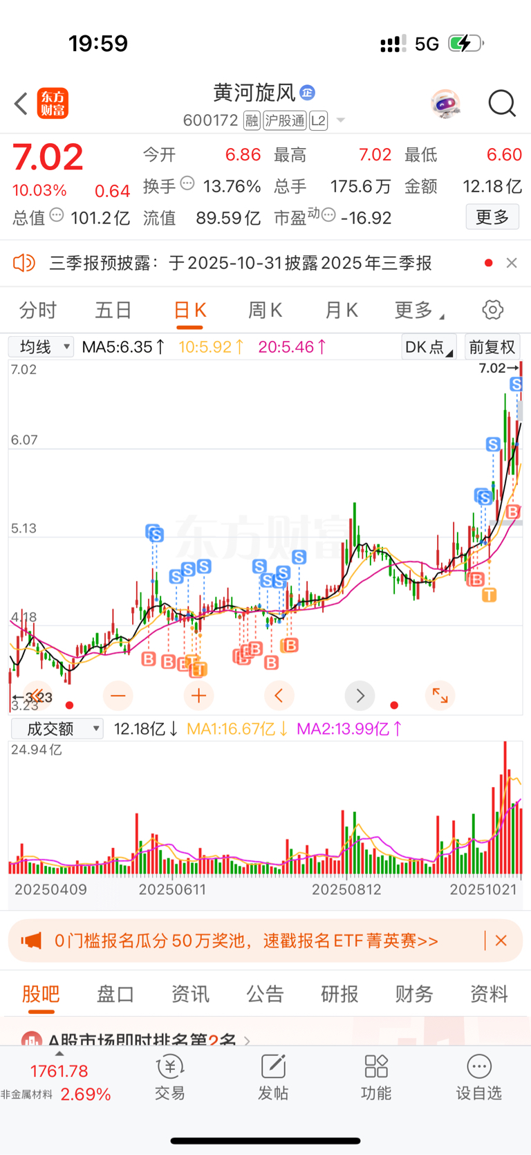 $黄河旋风(SH600172)$ 6月3号4.3买入黄河旋风,6月4号4.7成功逃顶。过后断断续续买买卖卖,虽未赚大钱,黄河从未套我。虽然没拿住,仍然感谢黄河不杀之恩。留下的人发财