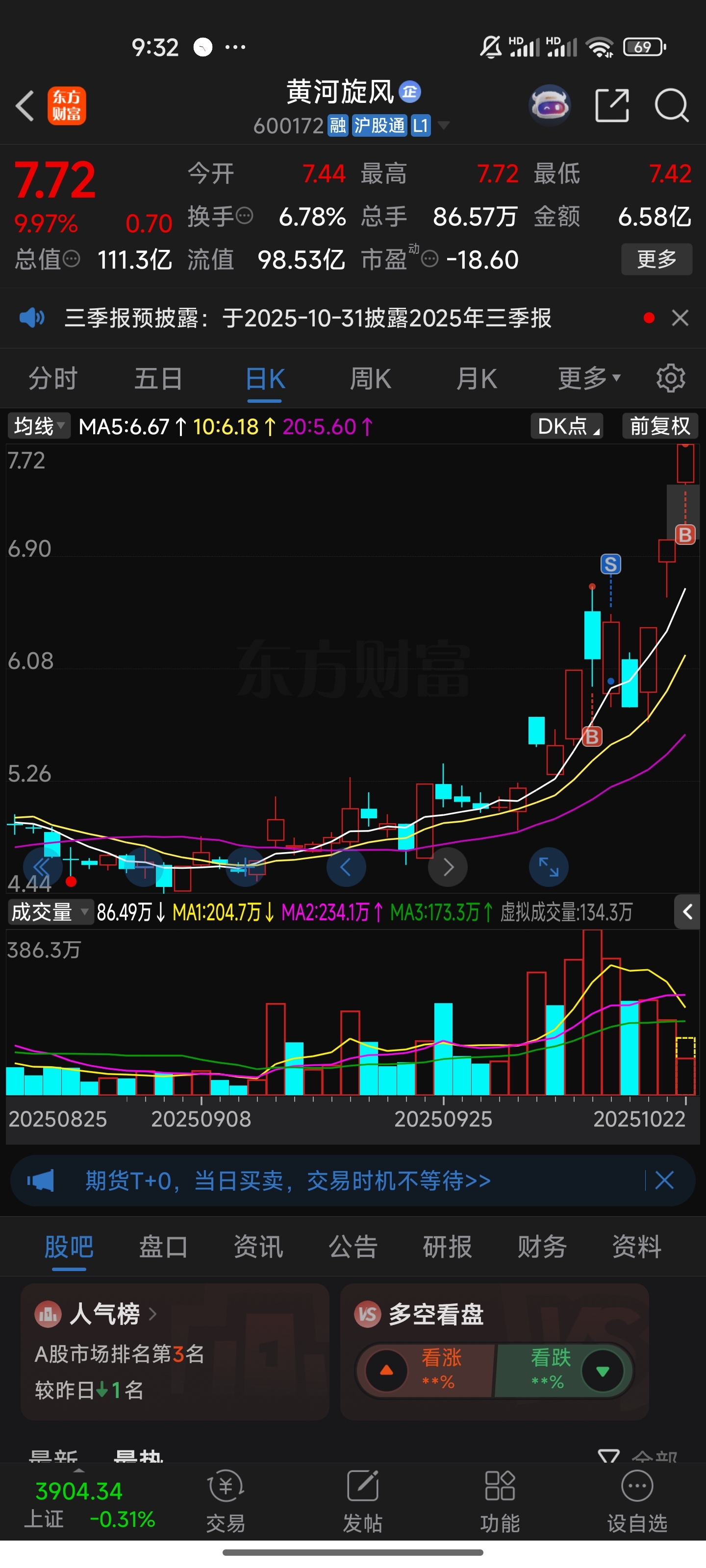 $黄河旋风(SH600172)$ 上次打板亏10个点,这次我又回来了,能回本吗?