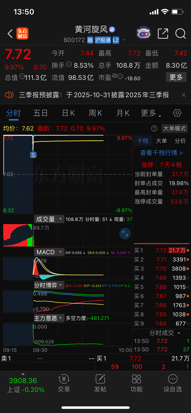 $黄河旋风(SH600172)$ 完了,明天要加速了