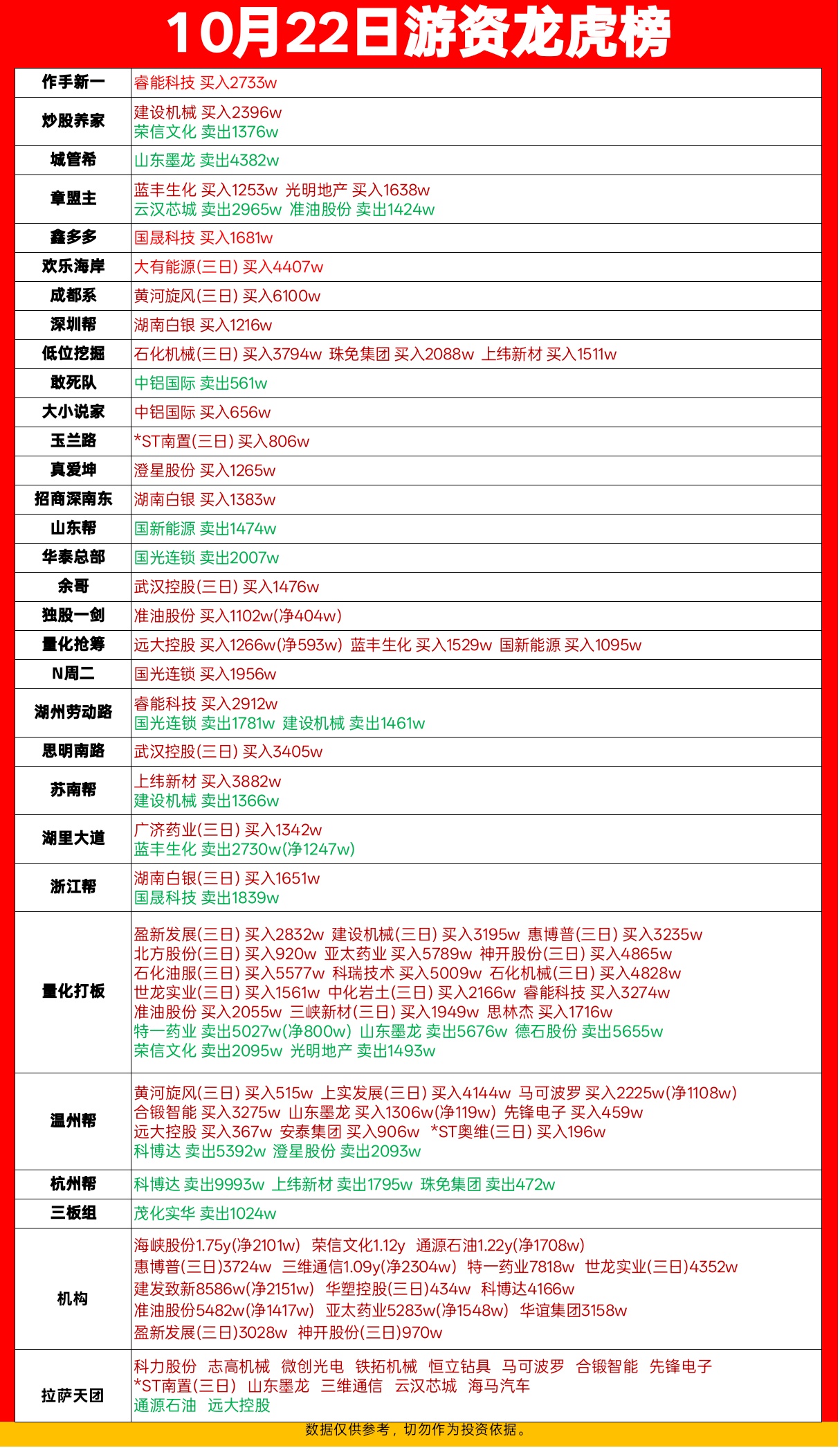 10.22游资龙虎榜,作手新一章盟主炒股养家上榜。