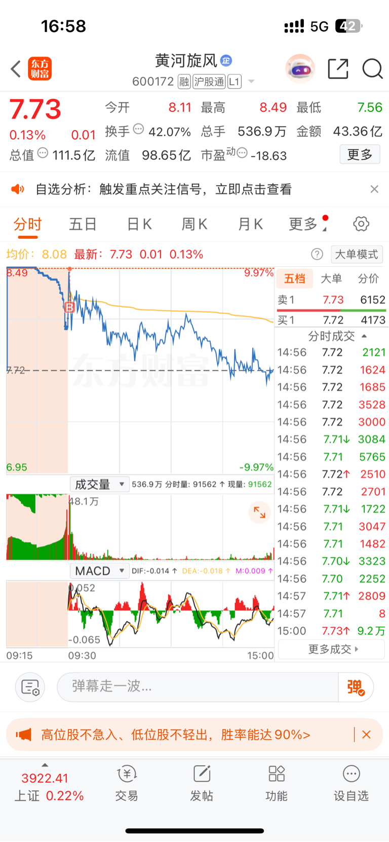 $黄河旋风(SH600172)$ 以后再也不会开盘打板了,还好仓位轻被挂在山顶了