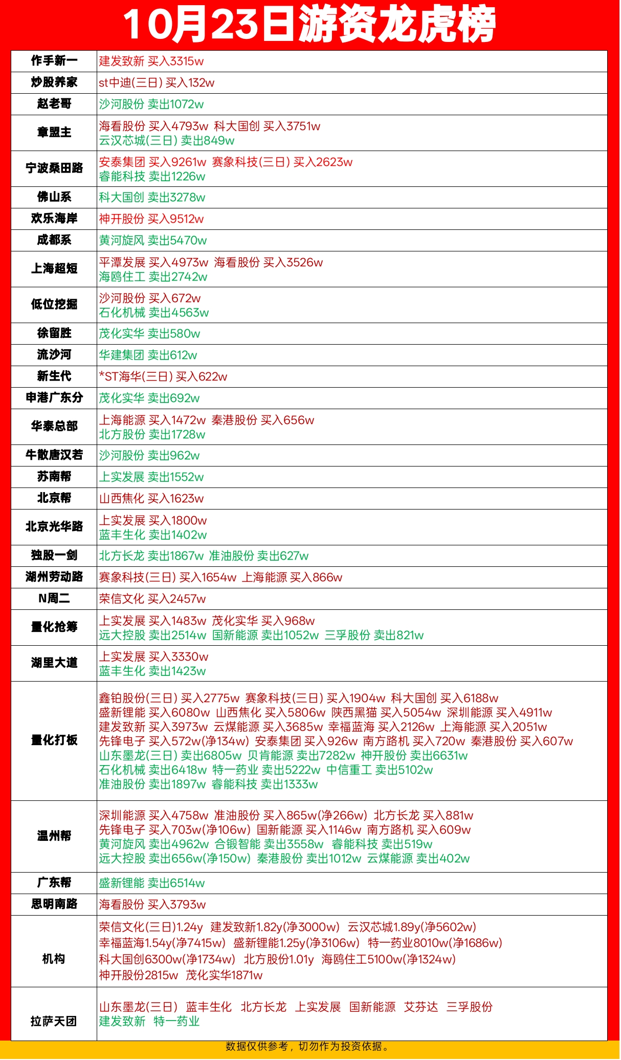 10.23游资龙虎榜,欢乐海岸章盟主成都系上榜。