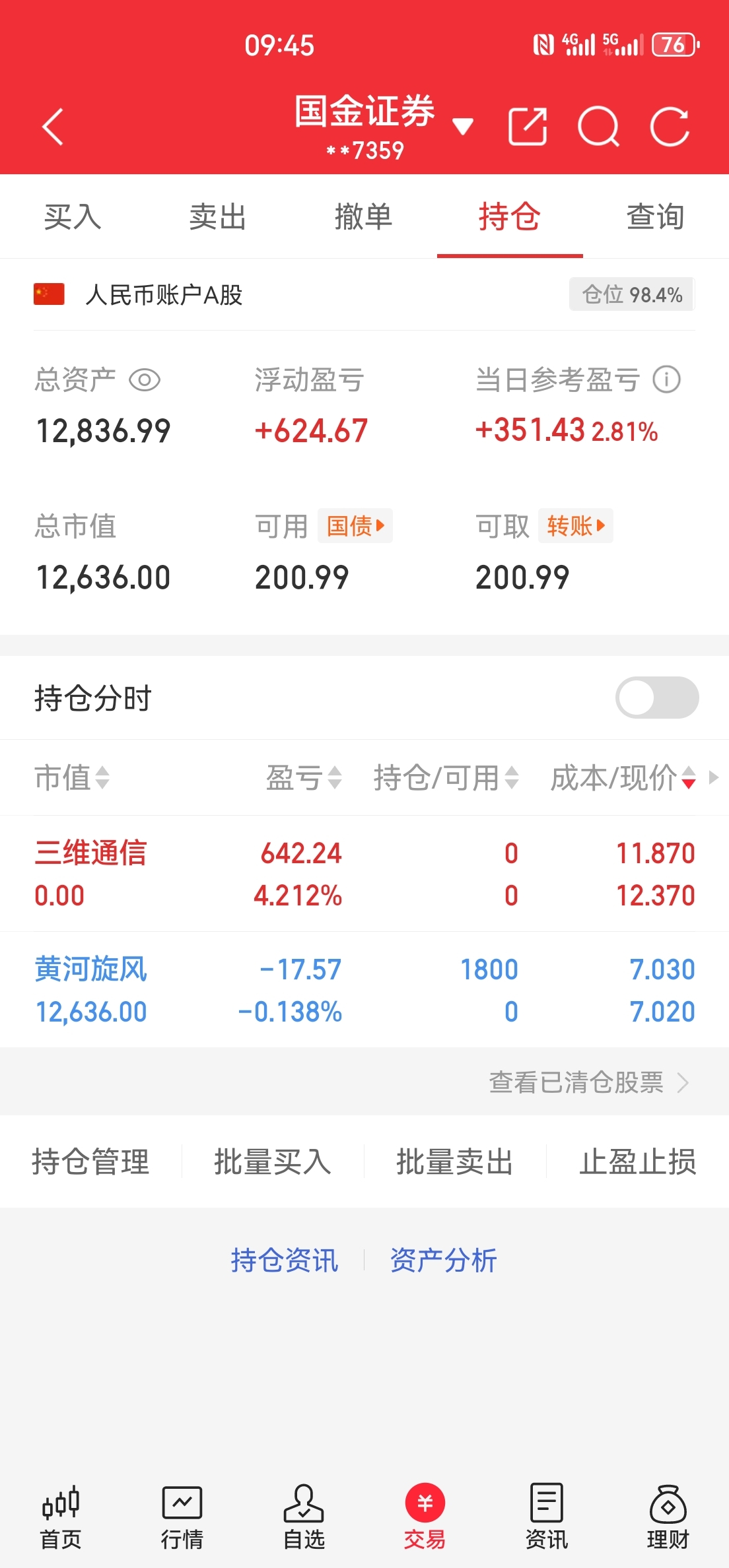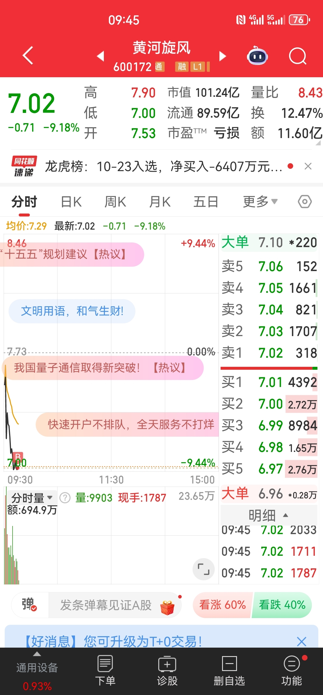 一万到一百万第四天,三维通信+3走了,-9买入黄河旋风