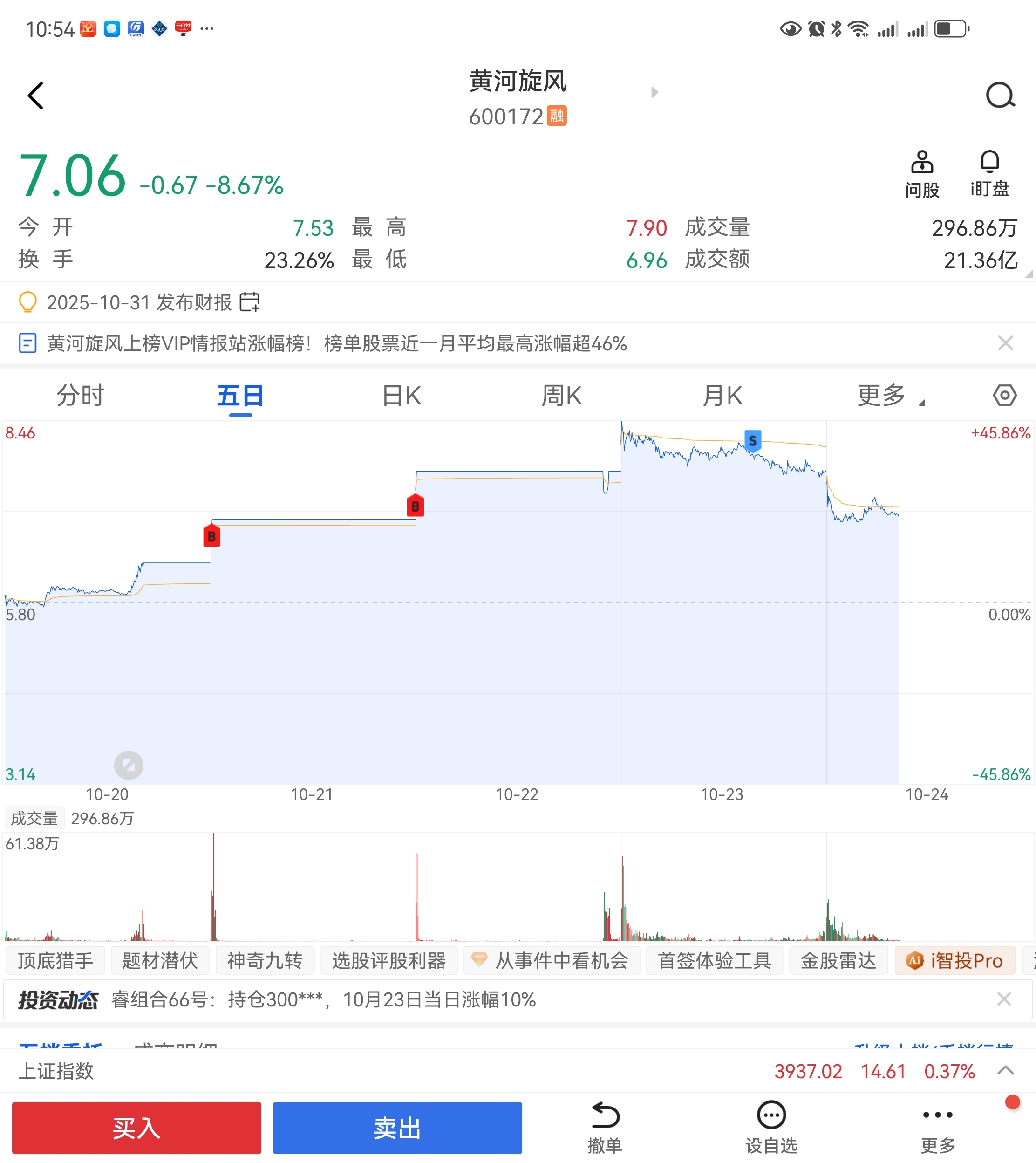 $黄河旋风(SH600172)$ 昨天冲高涨停回落跌破均线就应该清仓。