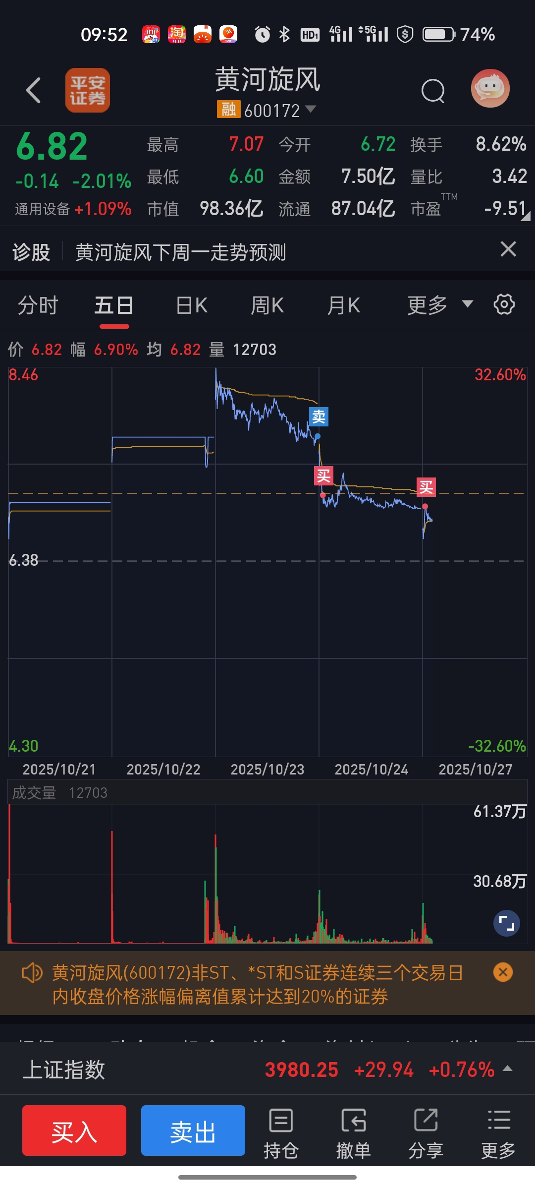 $黄河旋风(SH600172)$ #炒股日记# #复盘记录# #股市怎么看# #实盘记录# #投资干货# 加仓加早了,这只票可多留意一下,风险高回报率也高,呵呵,申通快递上周五也在我预测之中