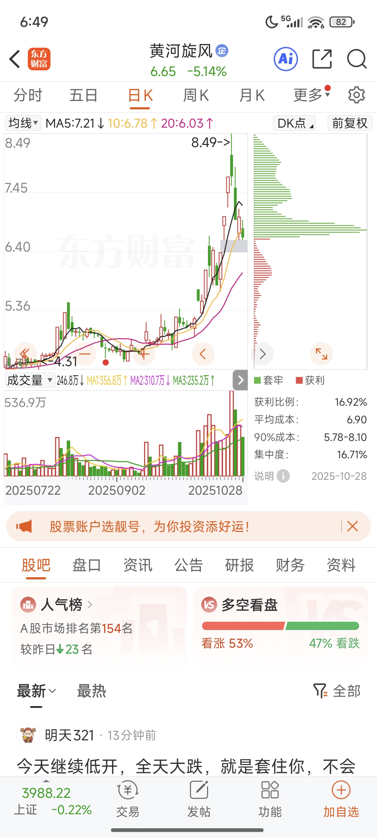 $黄河旋风(SH600172)$ 只有百分之十六点几赢利的了,今天如果再跌五个到十个点抄底就完美了