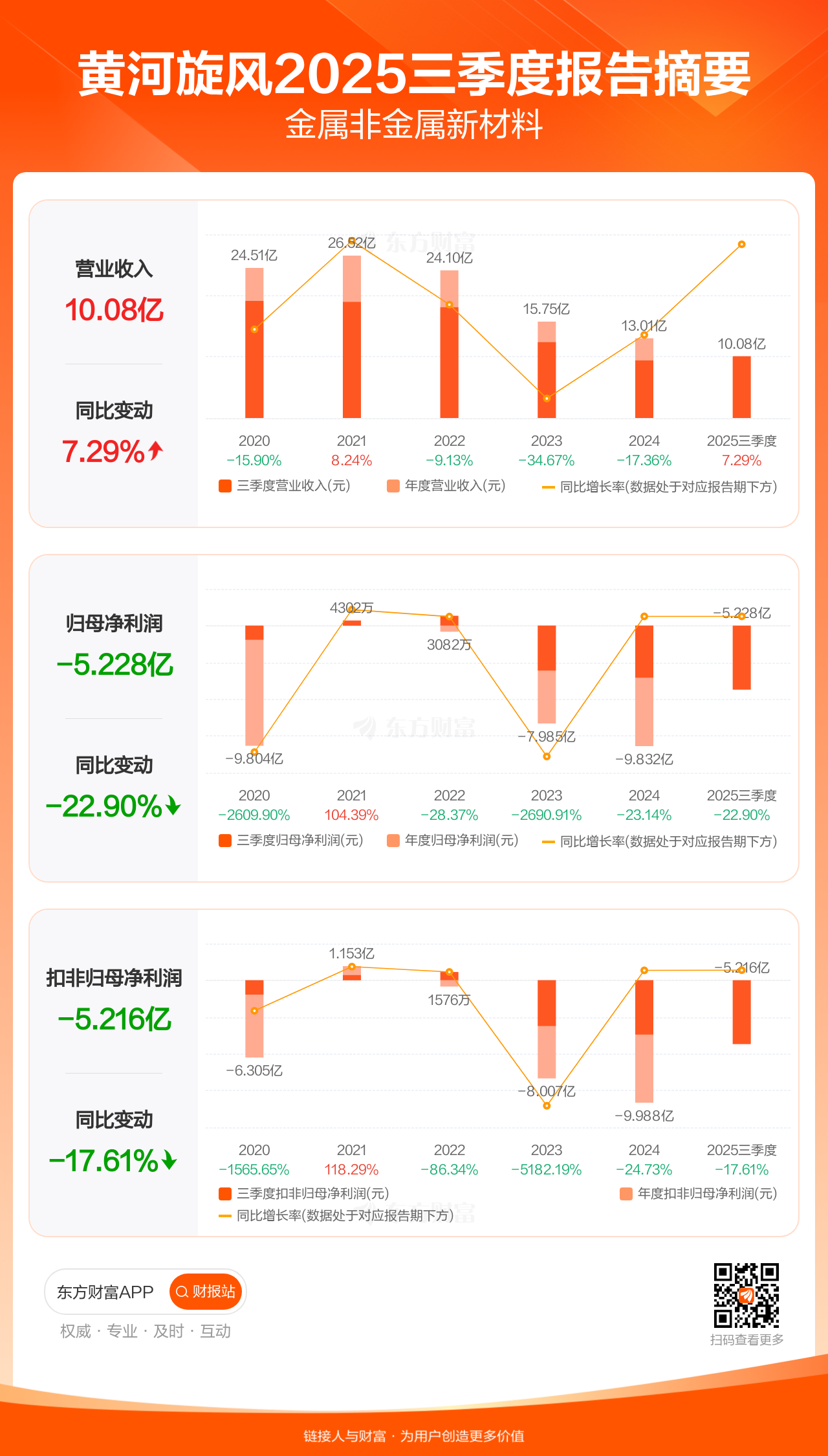 黄河旋风10月31日发布2025年三季报显示,公司前三季实现营业收入10.08亿元,同比增长7.29%;归母净利润-5.23亿元;扣非归母净利润-5.22亿元。