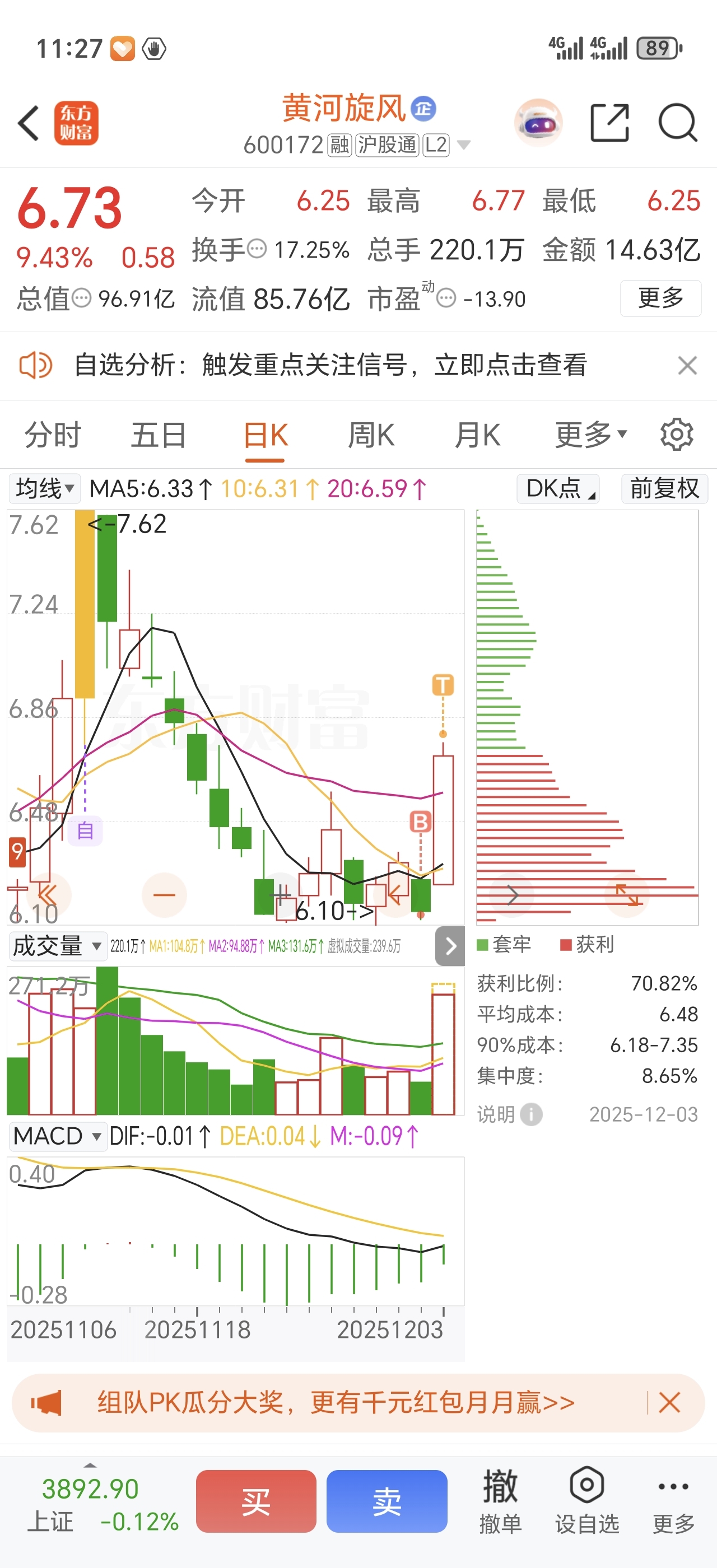 $黄河旋风(SH600172)$ 昨天进,今天T又是美好的一天。