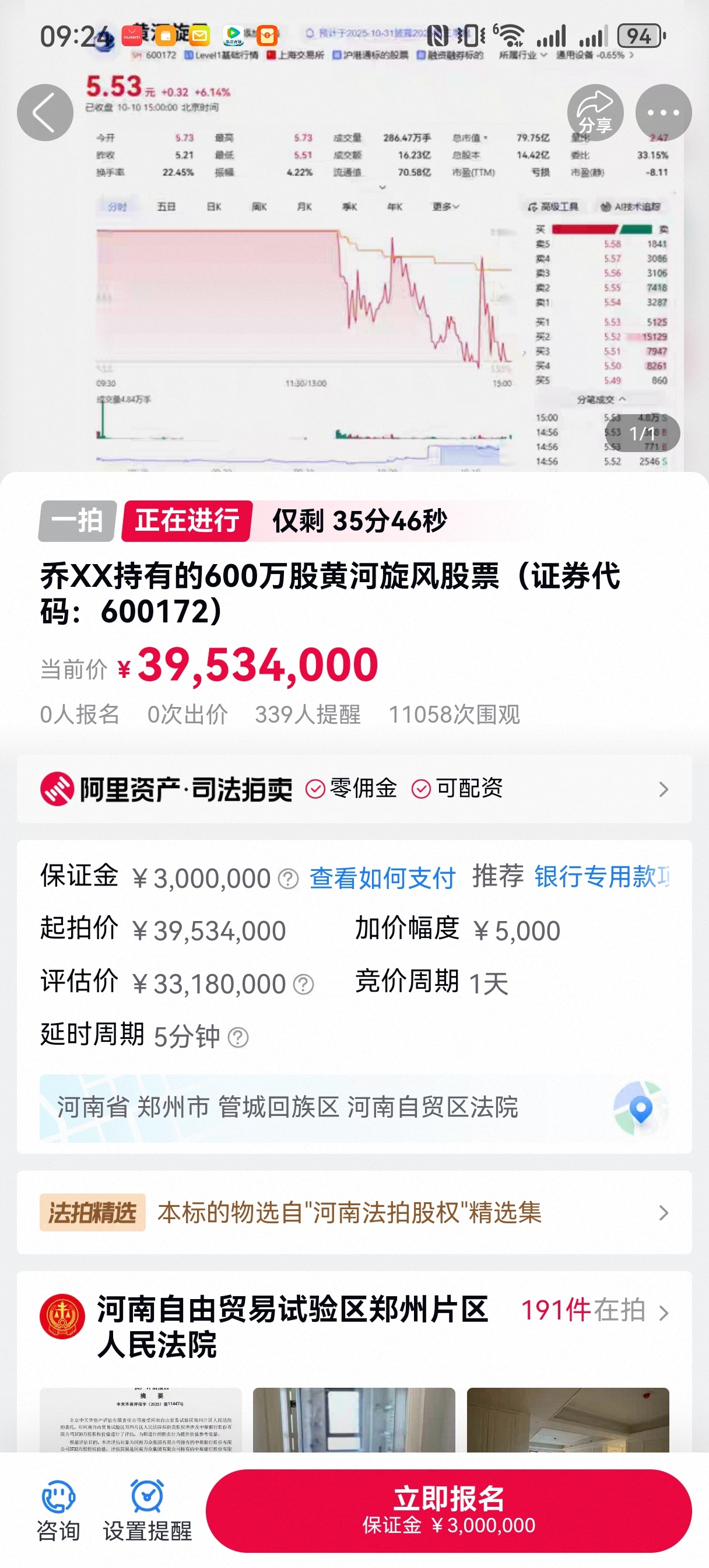 $黄河旋风(SH600172)$ 还剩半小时,没有报名,这是要流拍吗?
