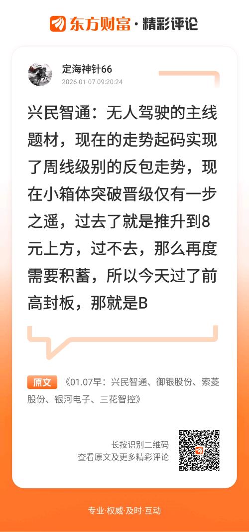 索菱股份:当前无人驾驶利好消息不断,造成了昨天板块集体上演涨跟超走势。,个股也是早早地封死3连板形态,在英伟达的相关入场加持之下,无人驾驶有望迎来一波热度的成长类型的炒作,因此个股有望冲击5连板。但是偏题材炒作的角度来看,标的一如果今天未能成功晋级,成功走出4连板结构形态,说明被板块淘汰,龙头个股争夺地位也将失败。因此,是否涨停也是海哥是否还会继续对其保持信心的关键。