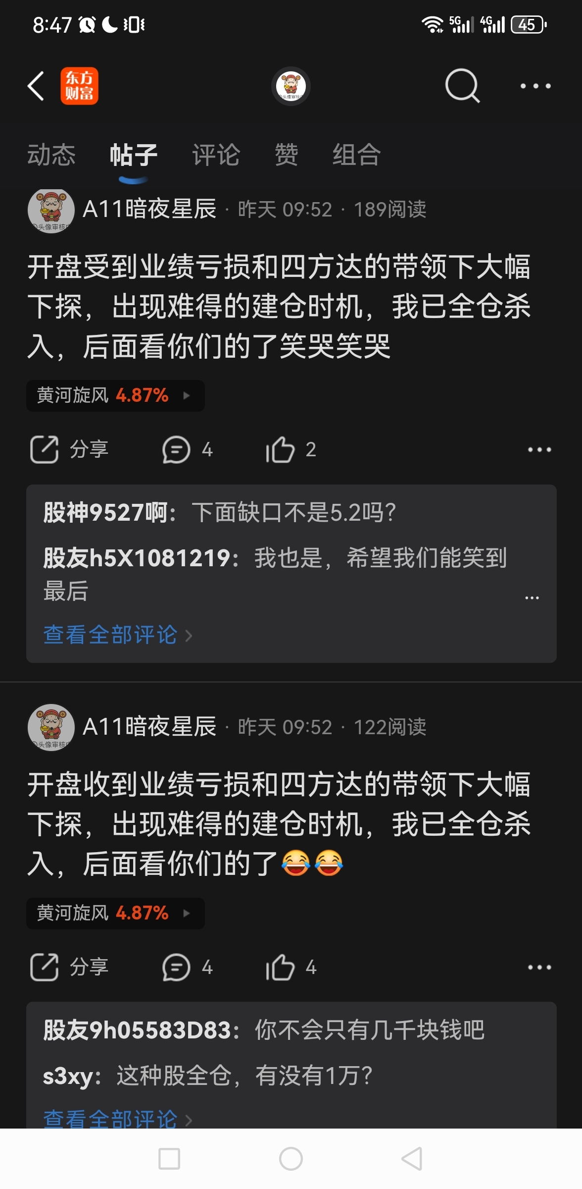 温馨提示: 1.根据《证券法》规定,禁止编造、传播虚假信息或者误导性信息,扰乱证券市场;2.用户在本社区发表的所有资料、言论等仅代表个人观点,与本网站立场无关,不对您构成任何投资建议。用户应基于自己的独立判断,自行决定证券投资并承担相应风险。《东方财富社区管理规定》
