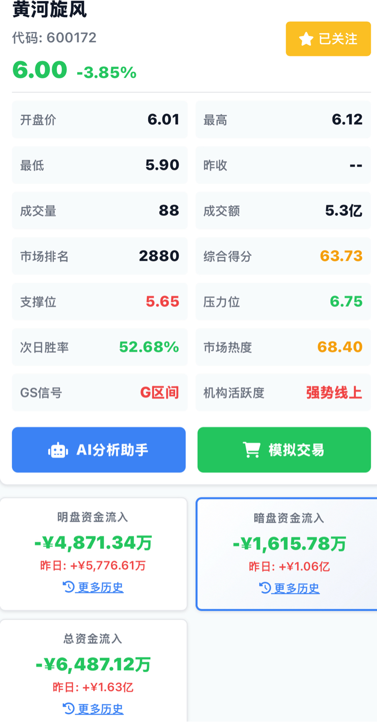 $黄河旋风(SH600172)$ 今天暗盘只流出昨日流入金额的15%,总资金还有1亿没有流出,进一步说明昨日触发的量化已被挂在山顶,明天有极大概率获得修复行情,今日尾盘买入的兄弟们明天大概率能吃肉,上攻5个点是基本操作,期待1月26号第一次临时股东大会除了商议交电费事宜或许有没有其他能谈的内容,如果没有,今年行情也就这样了!