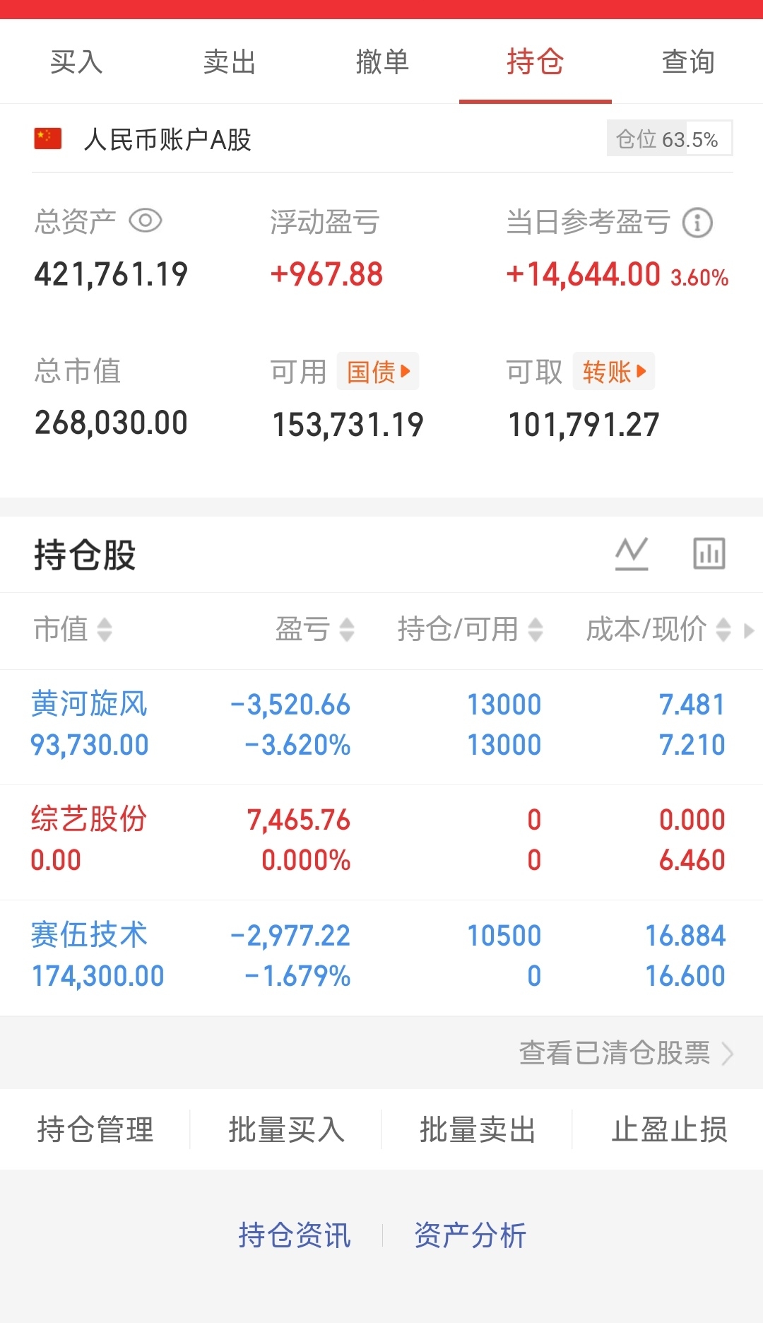目前持仓: 黄河旋风 赛伍技术