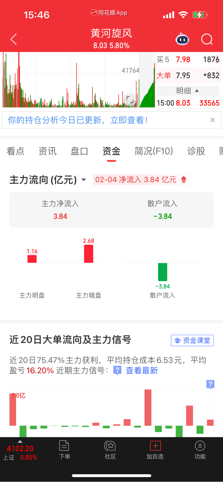$黄河旋风(SH600172)$ 明盘暗盘主力净流入,坐稳扶好,准备起飞