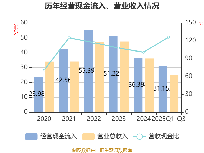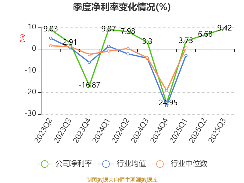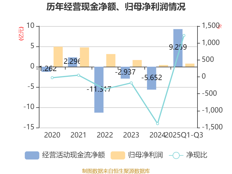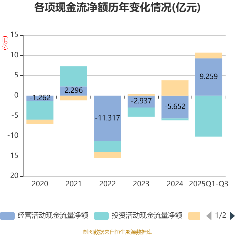 2025年前三季度,公司经营活动现金流净额为9.26亿元,同比增加10.89亿元;筹资活动现金流净额1.44亿元,同比增加1.03亿元;投资活动现金流净额-10.15亿元,上年同期为-1.71亿元。