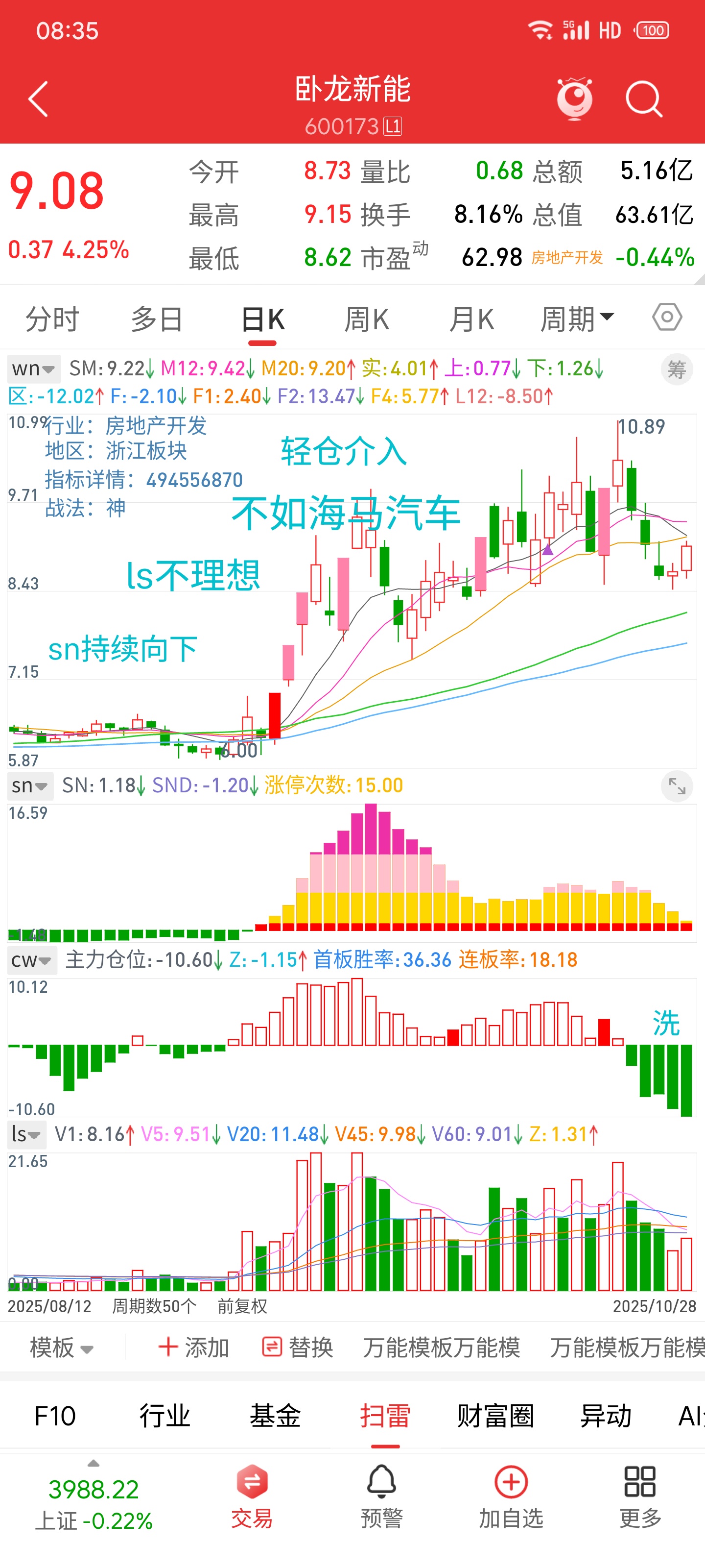 $卧龙新能(SH600173)$ 虽然放量大阳线,但是还没有突破M20,整体来说不如海马汽车。忍不住的话,可以轻仓介入。再观察吧。