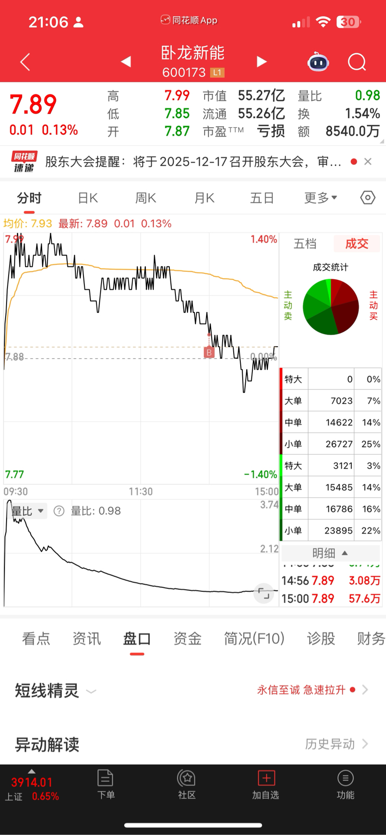 $卧龙新能(SH600173)$ 今日份操作,卧龙 明天见