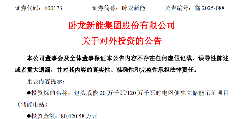 卧龙新能表示,此举为完善产业布局,促进公司新能源业务做强做优做大,提升公司盈利能力及持续发展能力。项目整体风险可控,不会对公司的财务及经营产生不利影响,不存在损害中小股东及投资者利益的情形。