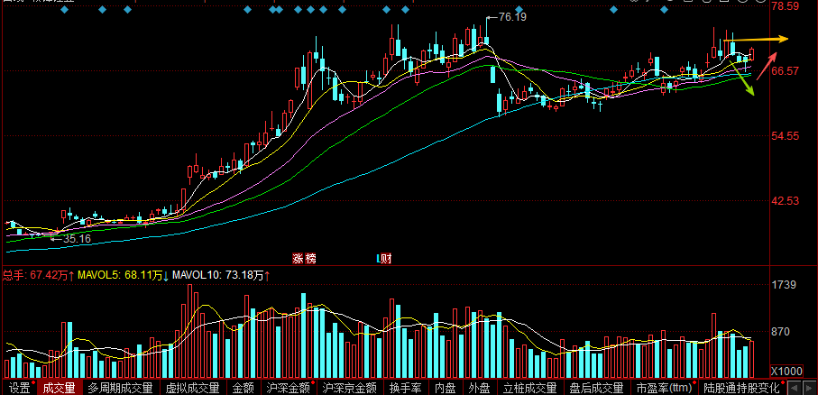 $三花智控(SZ002050)$近期维持箱体震荡走势,周一过了近期高度后出现回落,近两日呈现窄幅震荡态势。昨天走势震荡向上并收出阳线,虽冲高后有所回落,但整体呈现企稳向上态势,量价配合到位。叠加人形机器人概念走强,短期有望走出转强向上的表现,若今天能突破震荡区间,将有望开启新一波上升行情。下方支撑位关注五日均线,上方压力位关注60.77位置,继续观察。