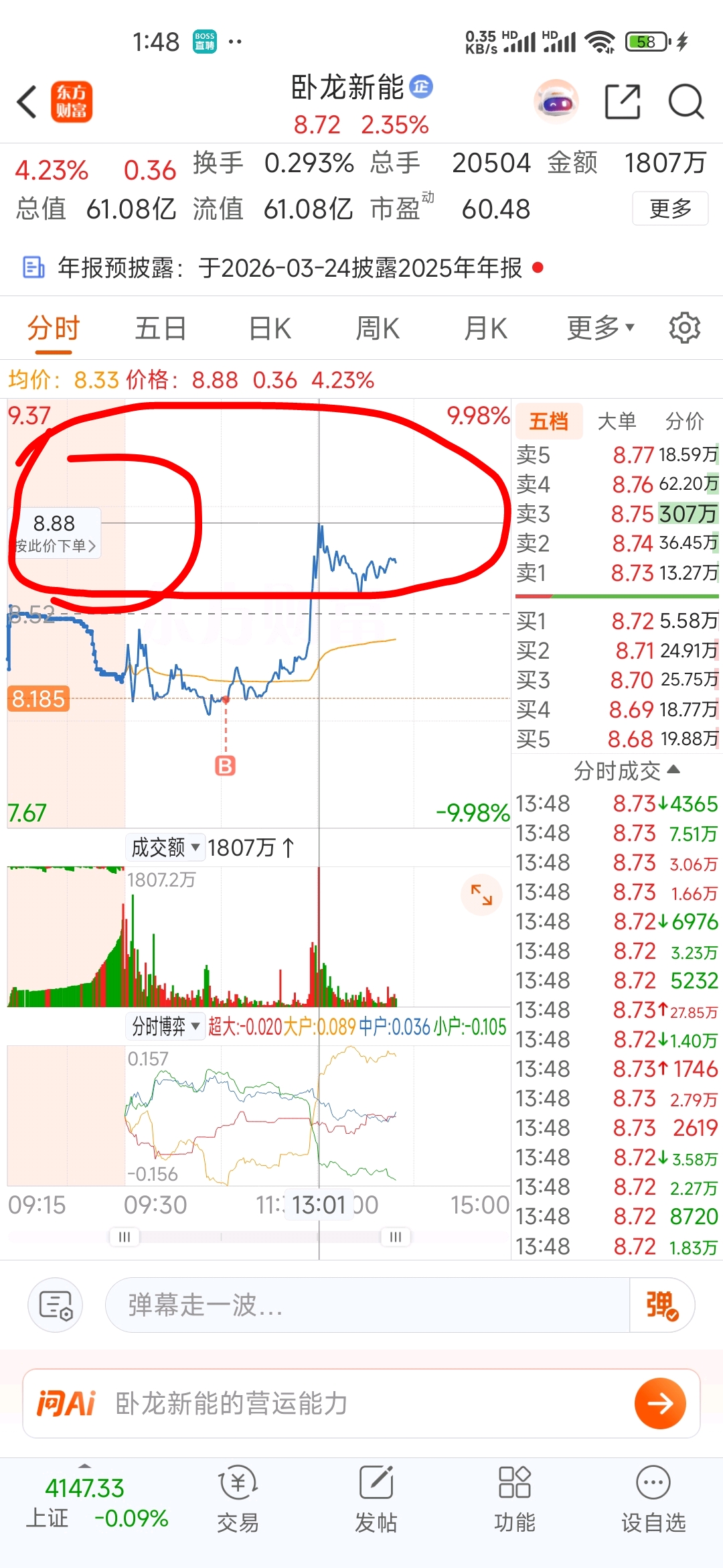 $卧龙新能(SH600173)$ 板块跳水了 还有这8.88有含义吗