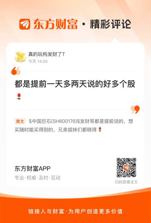 $中国巨石(SH600176)$  发财哥都是提前说的,想买随时能买得到的,兄弟姐妹们都晓得