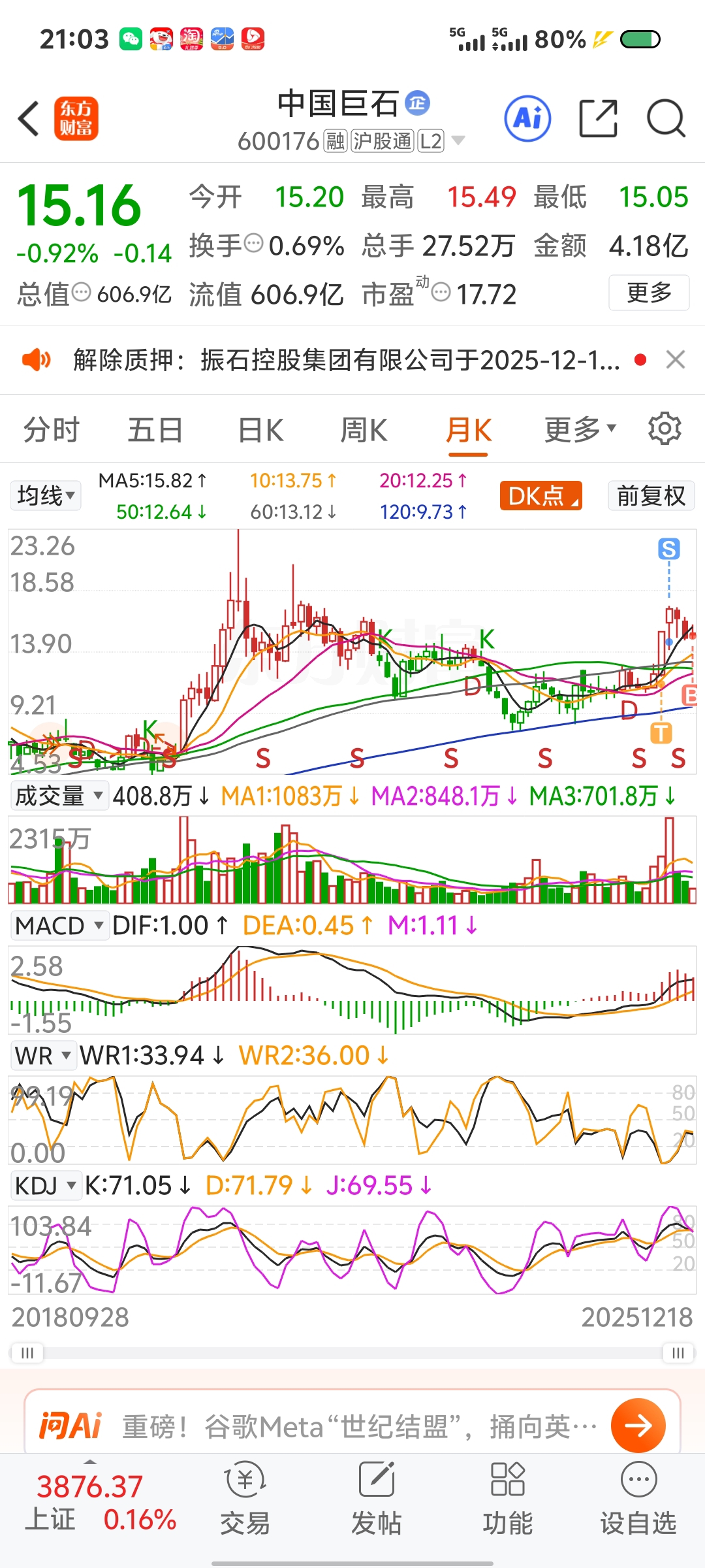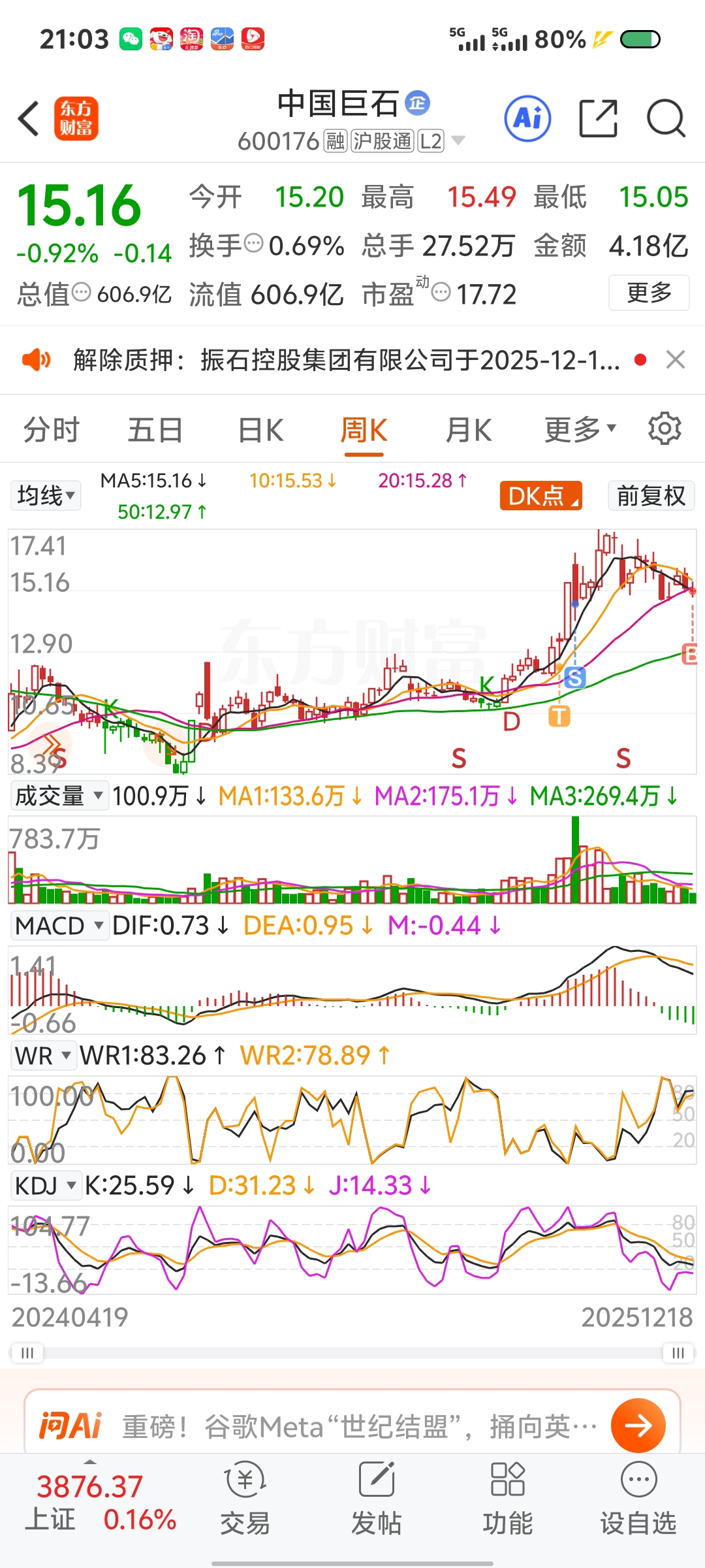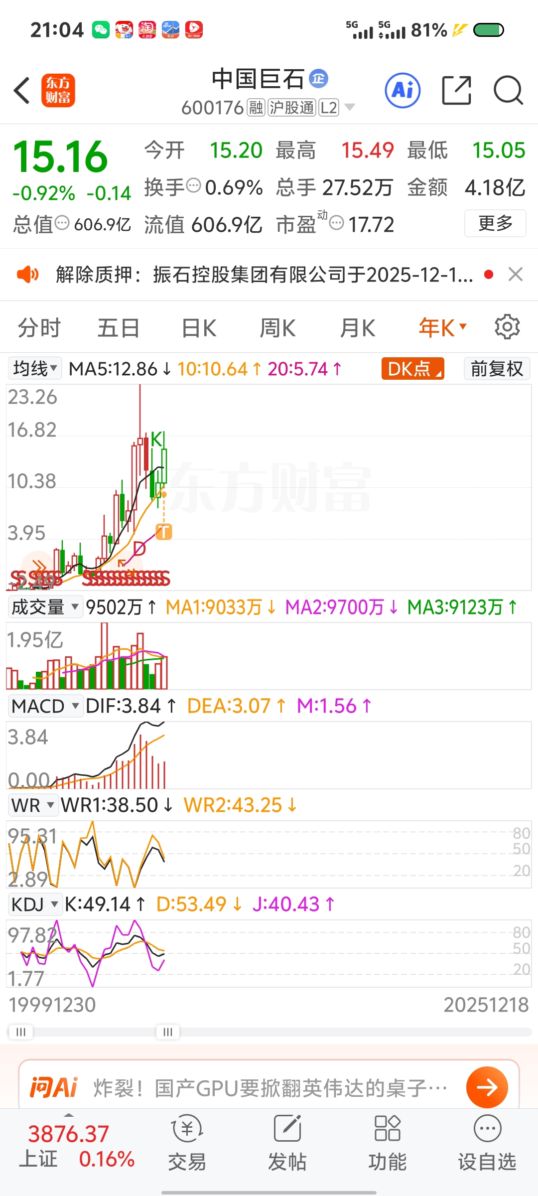 $中国巨石(SH600176)$ 这样的走势好怕啊#炒股日记# #投资随笔# #周末杂谈#