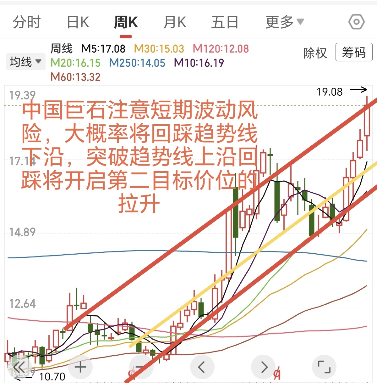 中国巨石第一目标价位17.95 波动上沿18.85 波动下沿17.05 由最高19.08可知中国巨石第一目标价位已经完成! 这里注意短期波动风险!短线跌破五日线止损。