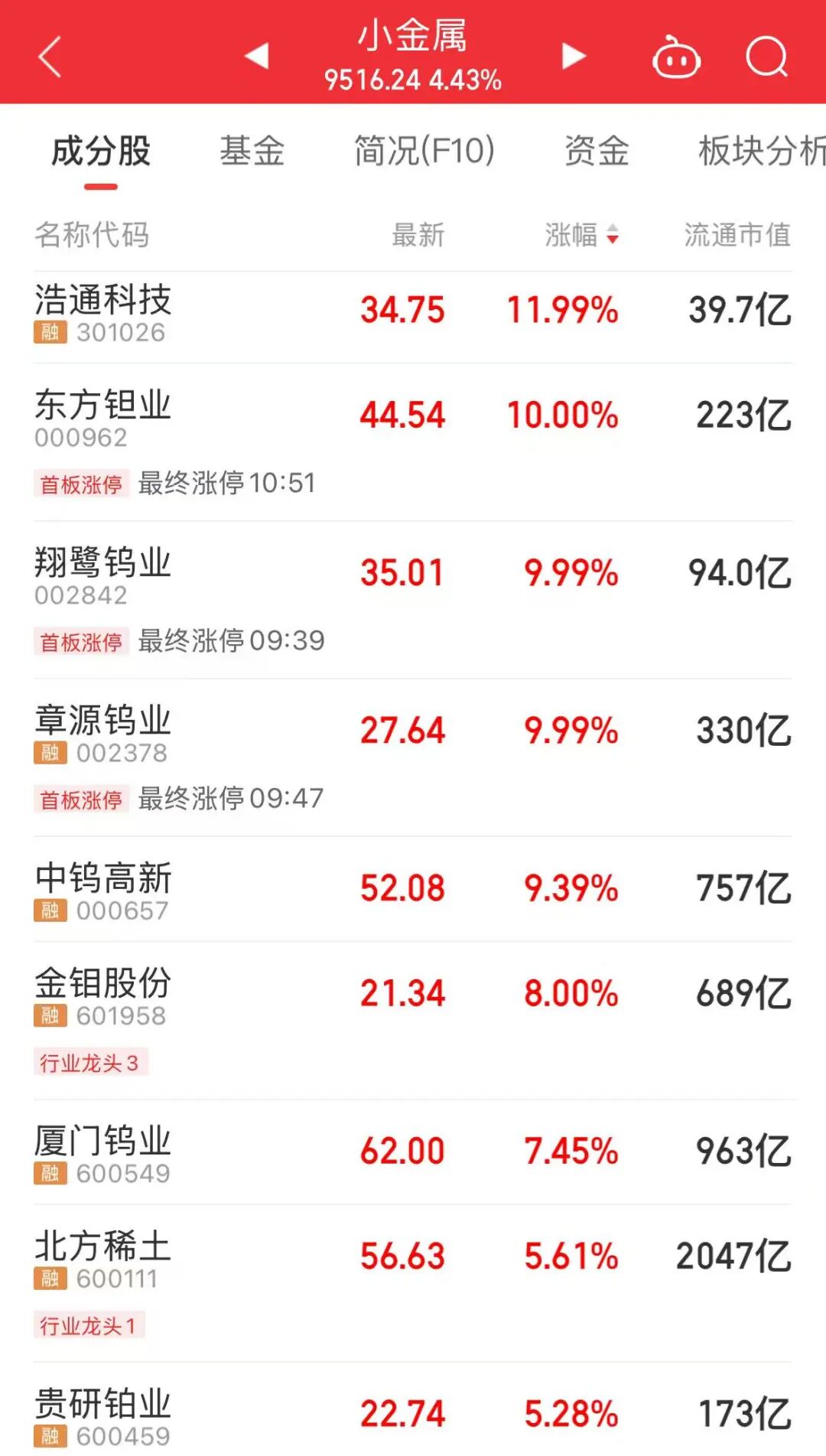 小金属板块上午大涨,章源钨业、翔鹭钨业、金钼股份等个股大涨。