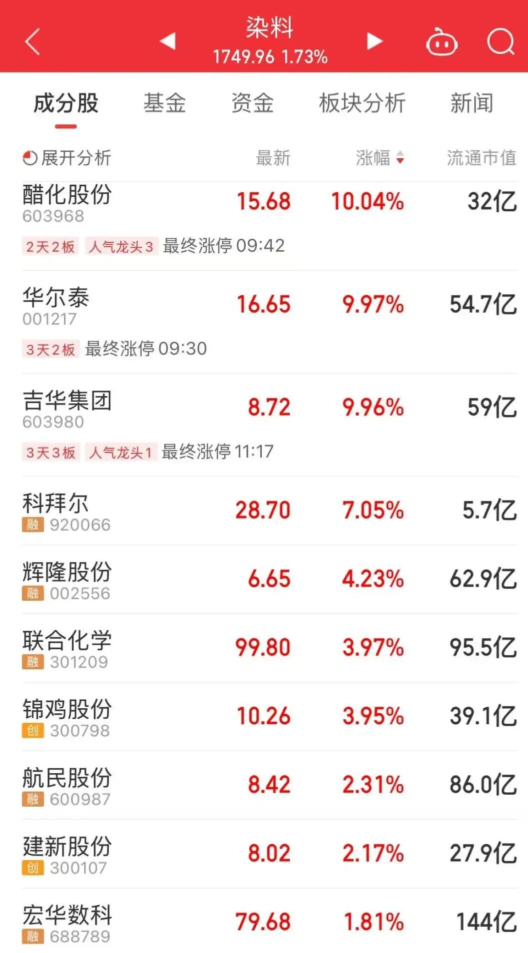 染料板块中,醋化股份、华尔泰等个股大涨。